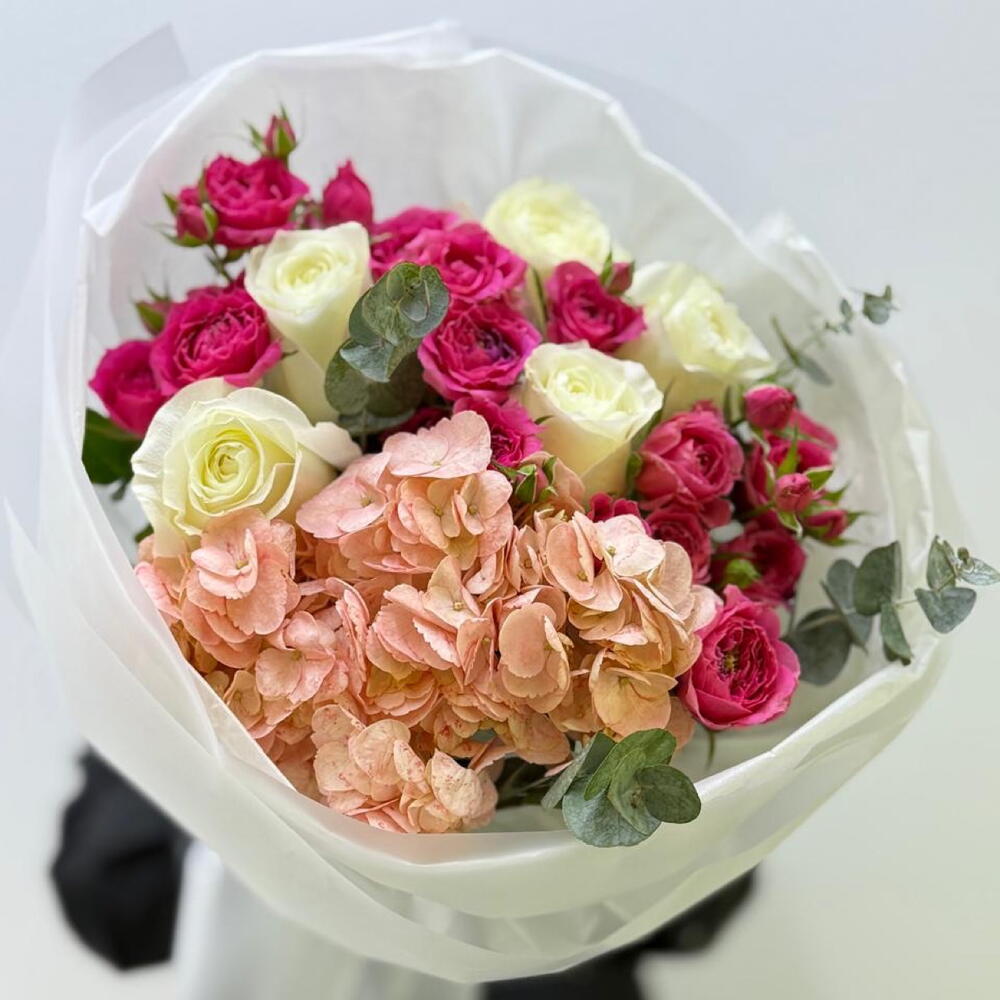 Роза Эквадор - 5 дана Қызғылт Гортензия - 1 дана бұта раушандары - 3 дана