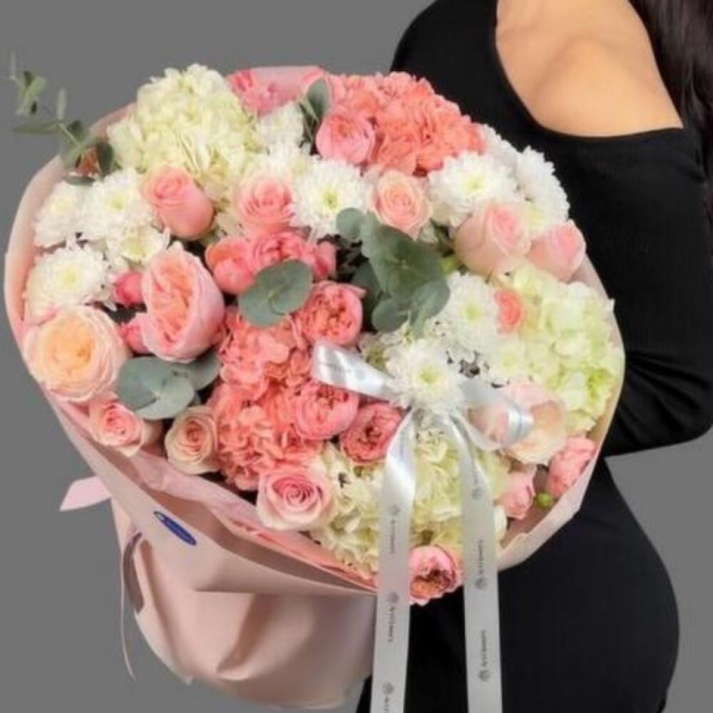 Гортензия - 5 дана Эвкалипт - 2 дана Бұталы хризантема - 4 дана Кустовая роза пионовидная - 5 дана аква бумага - 1 дана голландские розы 50 см - 11 дана