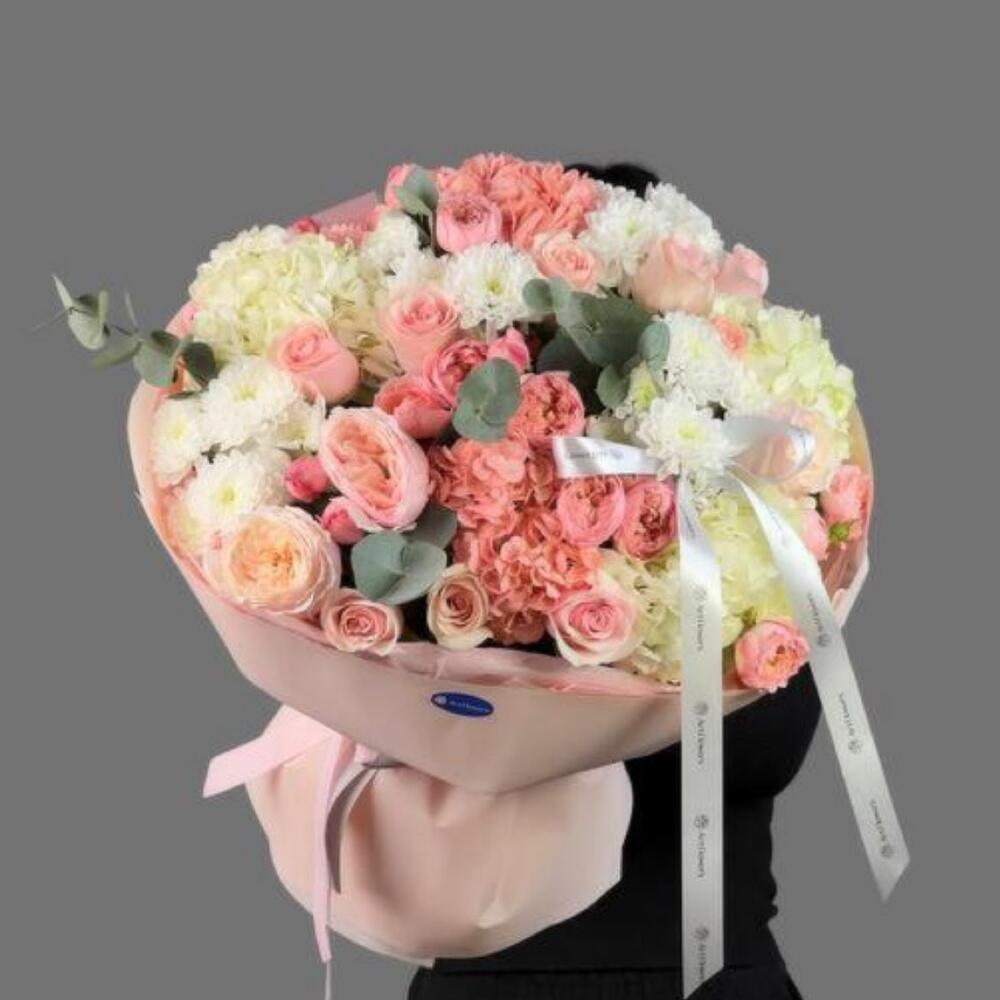 Букет в постельных тонах: гортензия, белоснежные кустовые хризантемы, пионовидные кустовые розы и нежно-розовые розы в стильном оформлении. Воздушная композиция для тонкой души — для мамы, невесты или любимой.