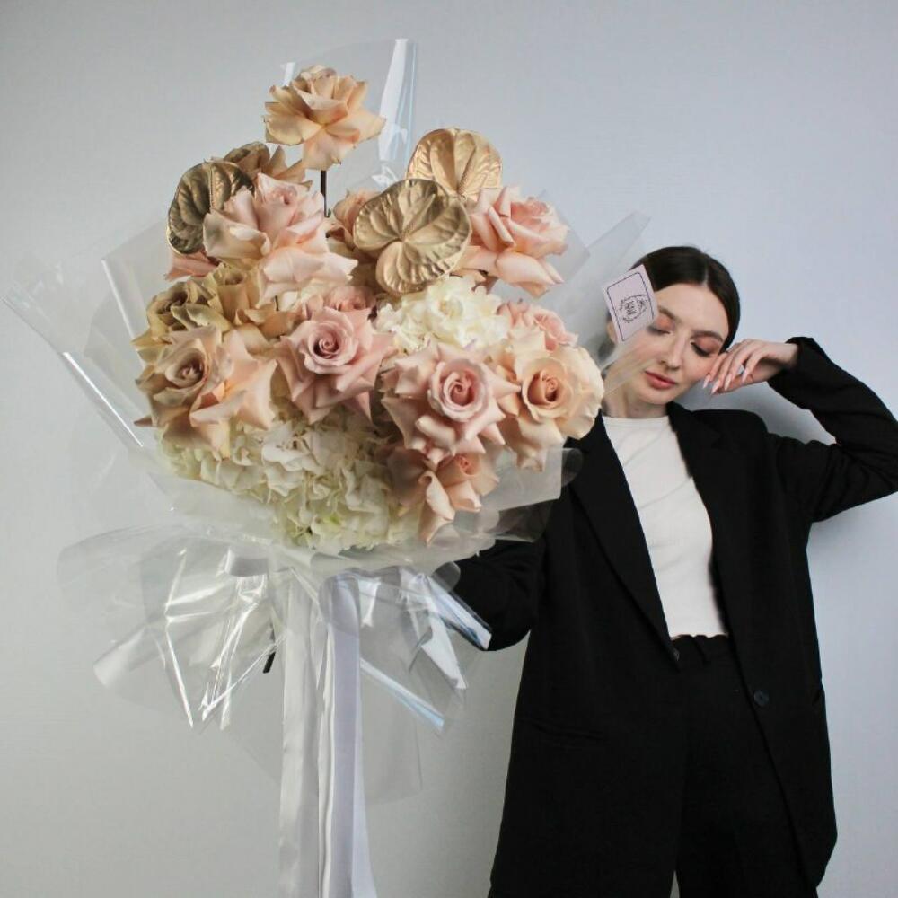 Пудровый букет с гортензиями, антуриумом и сортовыми розами