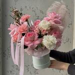 Утонченная композиция в шляпной коробке, наполненная нежностью и изысканностью пастельных оттенков. В составе: розовые розы, нежные кустовые розочки, воздушные гвоздики, декоративная зелень и акцент из пушистого пера. Оформлена шелковистыми лентами, гармонично дополняющими общую палитру. Подойдет для: стильного подарка, комплимента на свидание или особого проявления внимания. 🎀 Шарм и легкость в каждом лепестке.