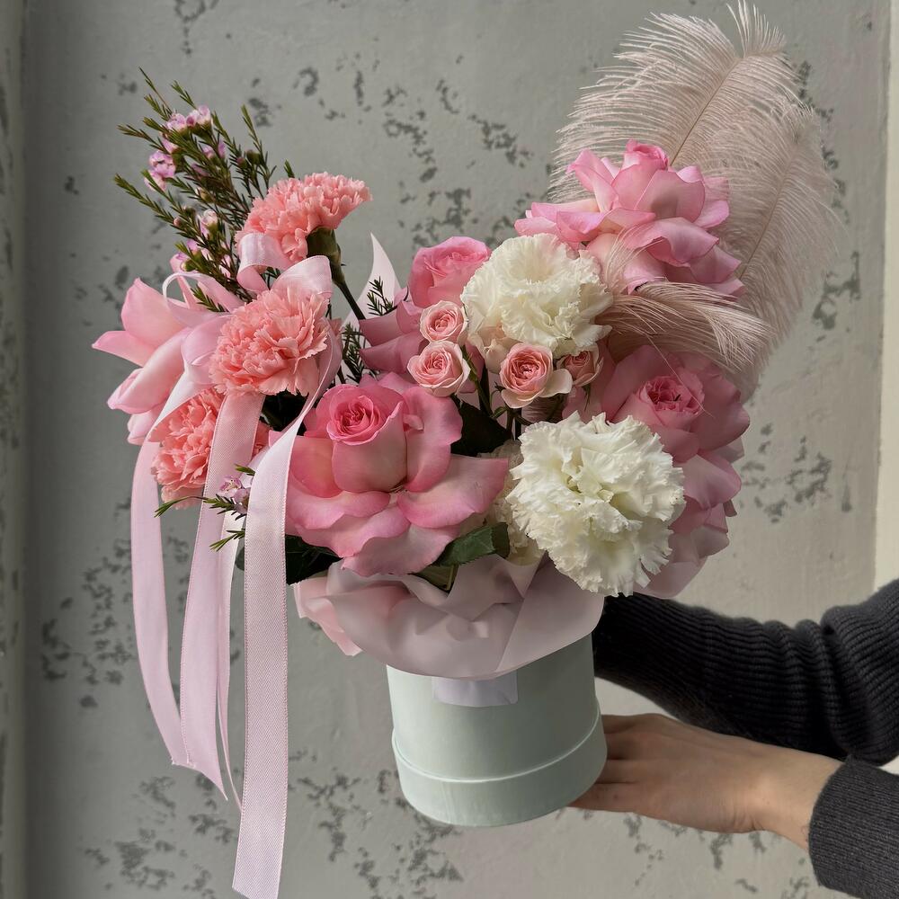Утонченная композиция в шляпной коробке, наполненная нежностью и изысканностью пастельных оттенков. В составе: розовые розы, нежные кустовые розочки, воздушные гвоздики, декоративная зелень и акцент из пушистого пера. Оформлена шелковистыми лентами, гармонично дополняющими общую палитру. Подойдет для: стильного подарка, комплимента на свидание или особого проявления внимания. 🎀 Шарм и легкость в каждом лепестке.