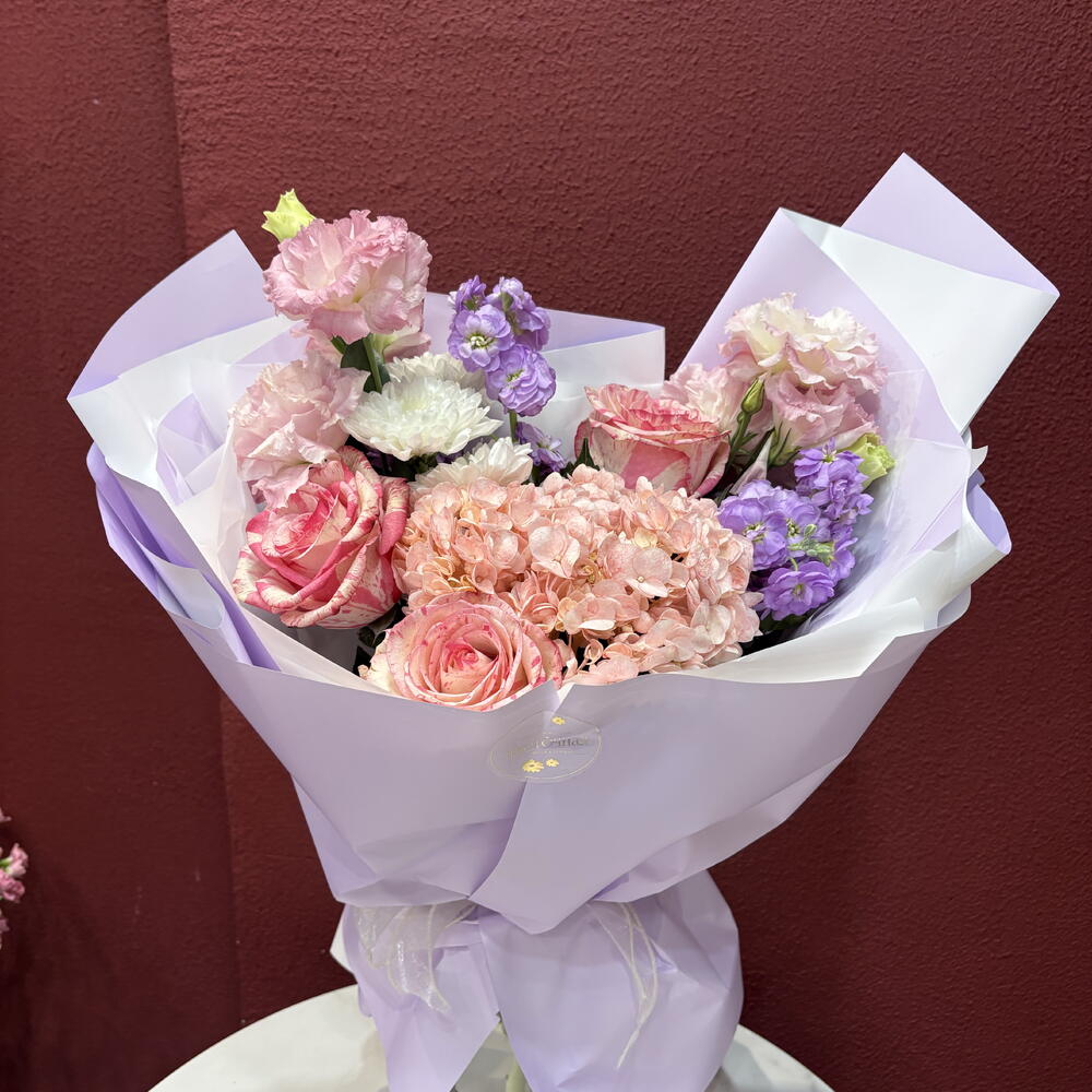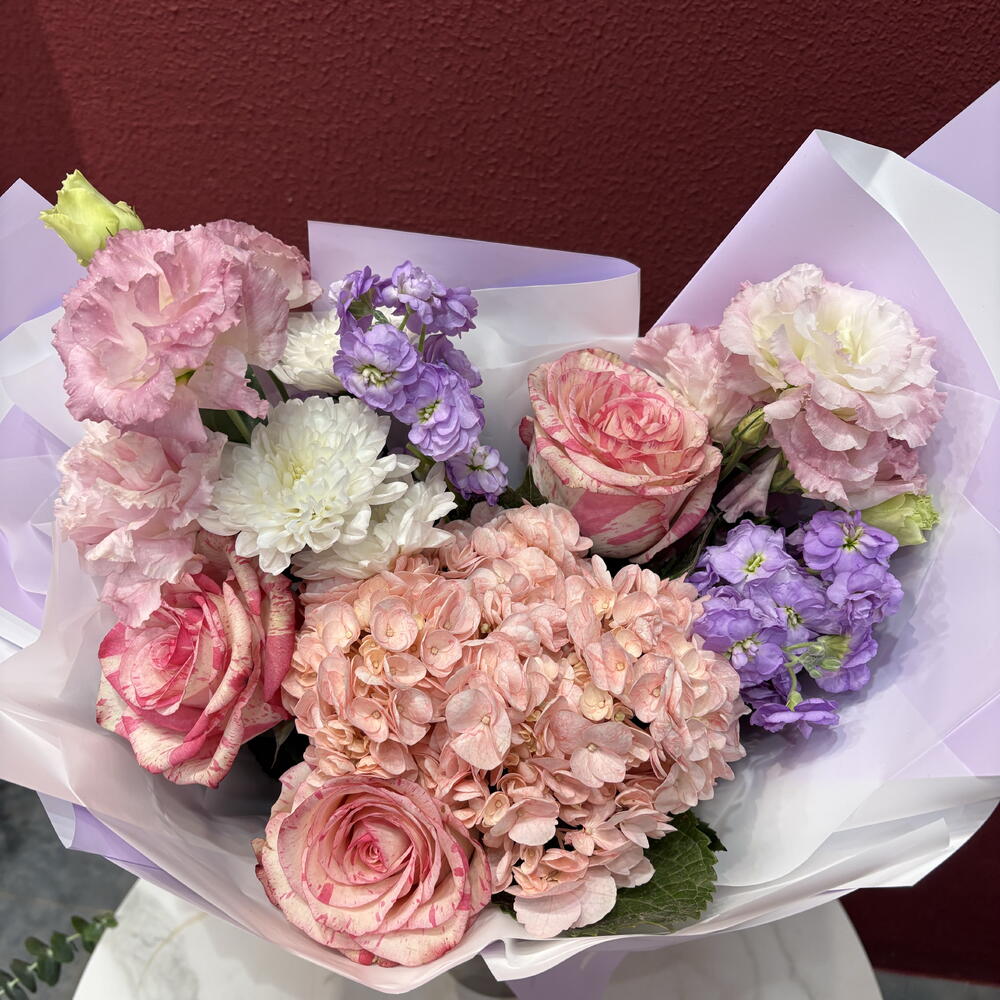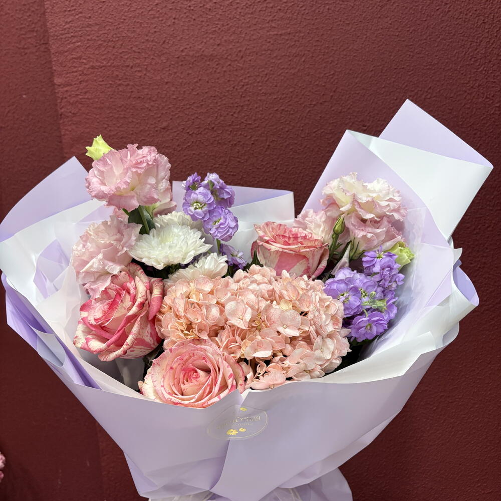Гортензия - 1 дана Хризантема бұтасы - 1 дана Эвкалипт - 2 дана Гвоздика - 1 дана Роза сортовая - 3 дана маттиола кустовая - 2 дана