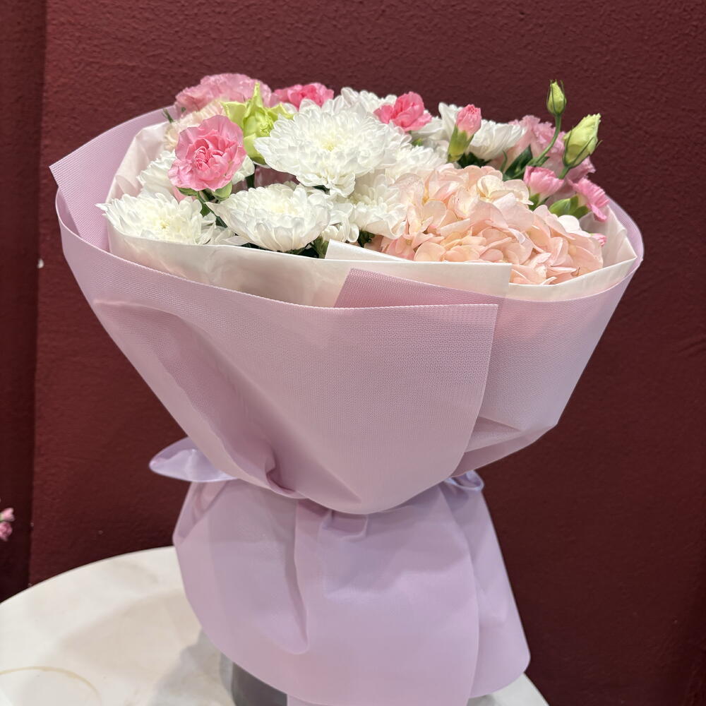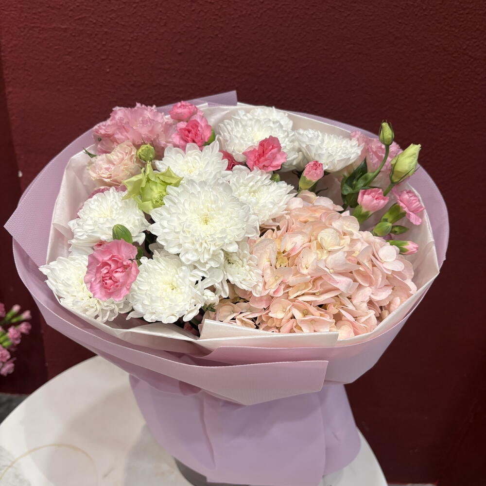 Хризантема - 1 дана Эустома - 2 дана Гвоздика кустовая - 4 дана гортензия премиум - 1 дана розы пинк экспрешн - 2 дана