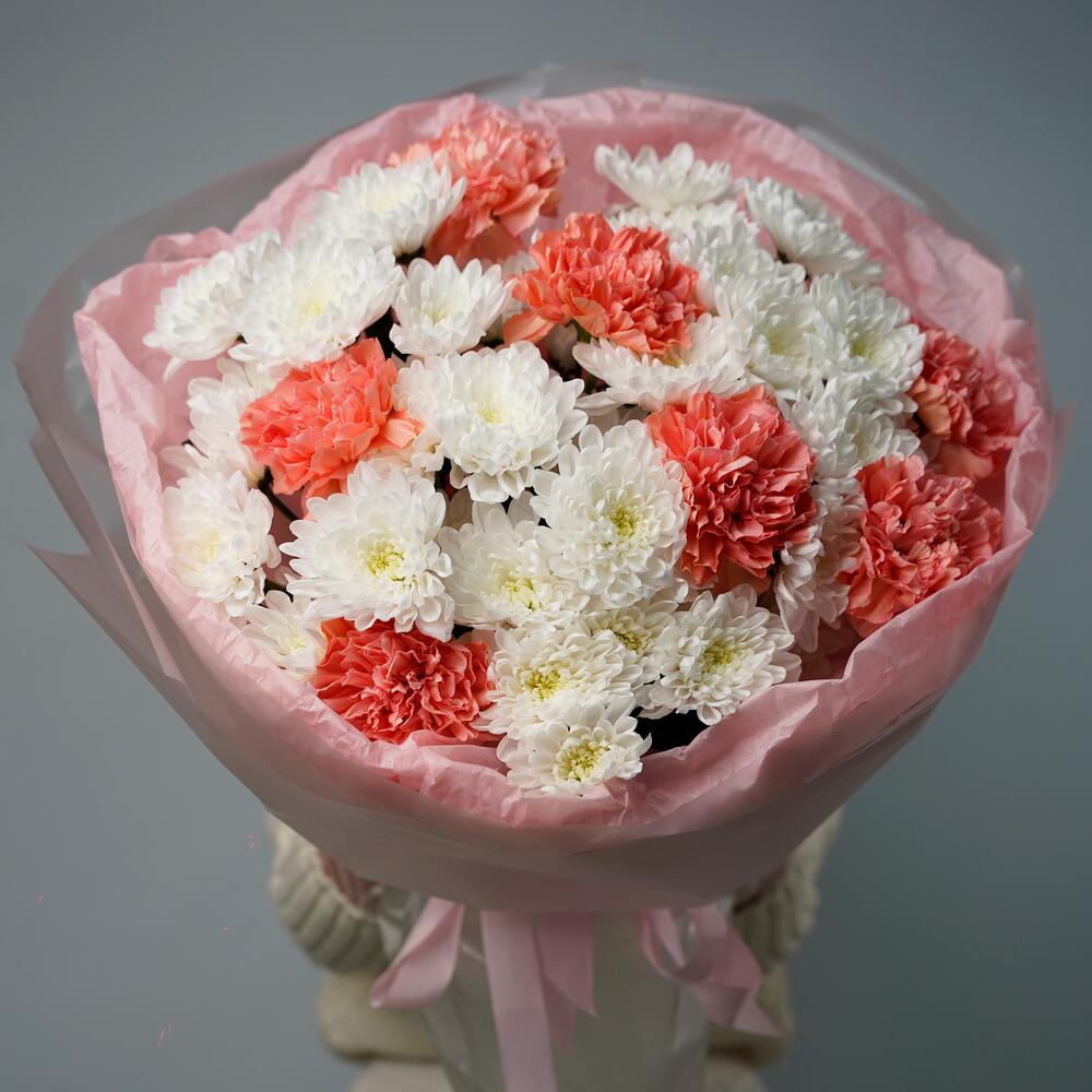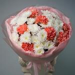 Этот букет словно первые лучи солнца, касающиеся земли в ранний утренний час. Нежные белоснежные хризантемы и диантусы в коралловом оттенке создают атмосферу свежести и надежды. Дарите тепло и свет, которые остаются в сердце надолго!
