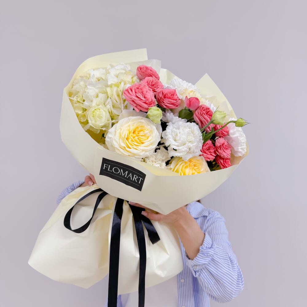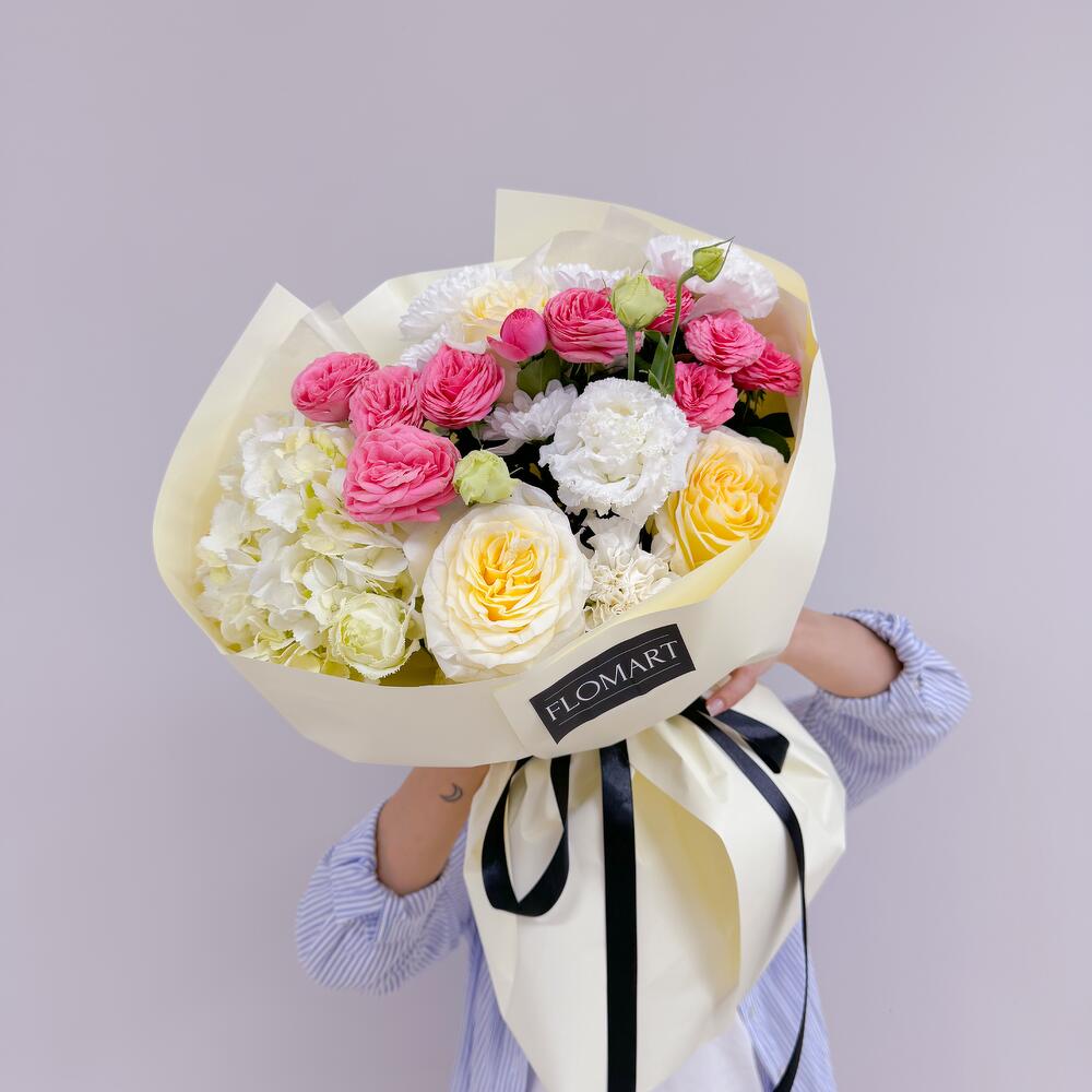 Гортензия - 1 дана Раушан - 3 дана Бұта раушаны - 2 дана Хризантема - 1 дана Эустома - 1 дана