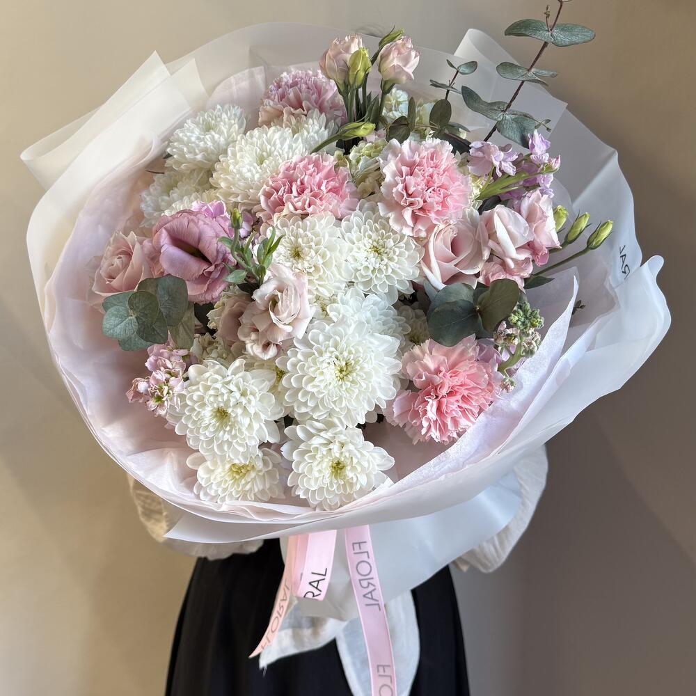 Этот авторский букет говорит сам за себя, он воплощает в себе элегантность и утонченность. Букет состоит из идеально подобранных друг к другу цветов: нежные лизиантусы, ароматные маттиолы, классические розы, изящные гвоздики и роскошные премиум хризантемы. Всего по три штуки каждого цветка, что делает букет идеально сбалансированным. Этот букет станет удачным подарком для каждого праздника или просто потрясающим способом показать свою любовь и заботу.