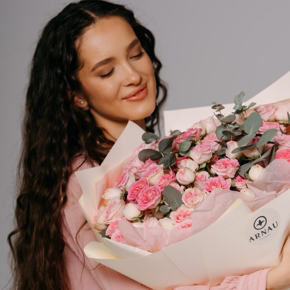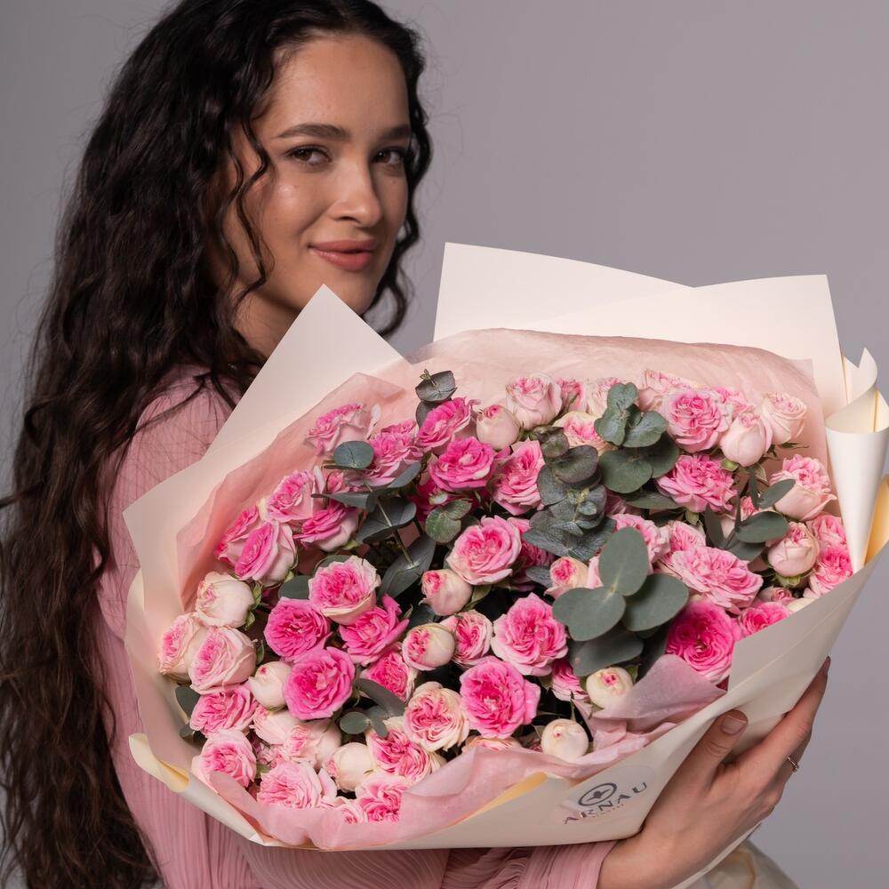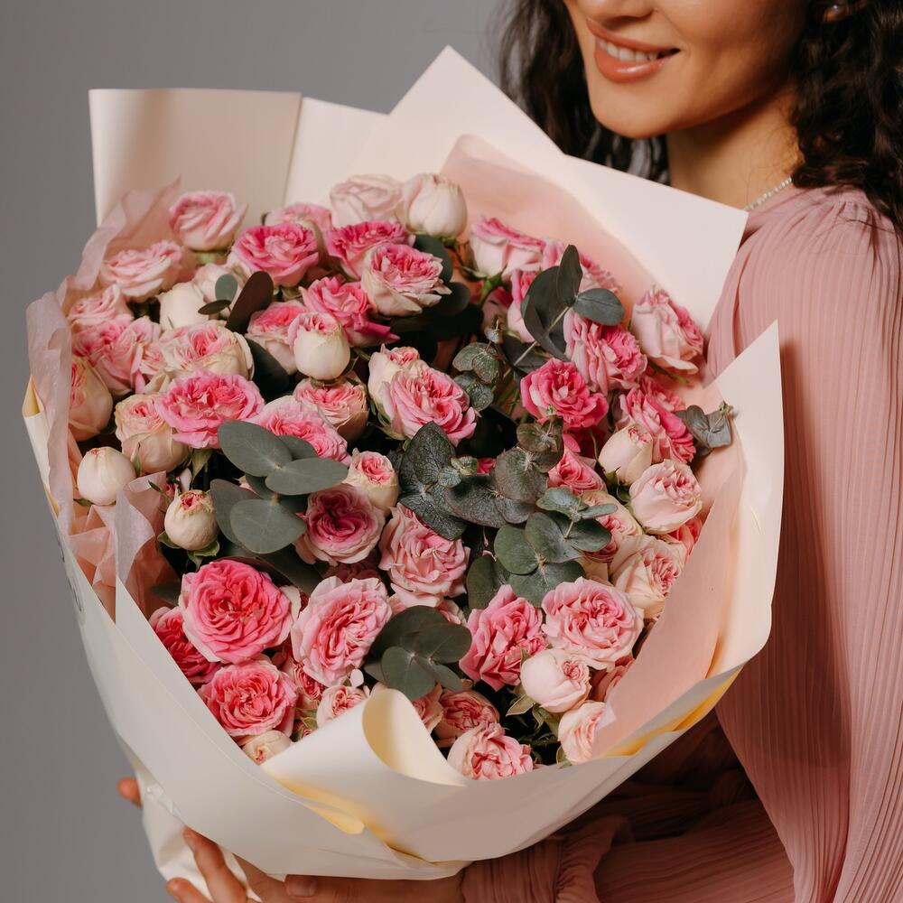 Эвкалипт - 3 дана Дизайнерлік қаптама - 1 дана кустовая пионовидная роза gelato - 15 дана