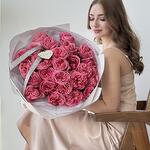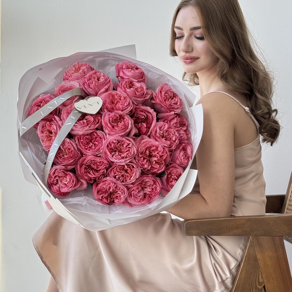 Безупречная красота розы Pink Expression - завораживает. Пионовидная роза сорта Pink Expression имеет очень крупный бутон, с изящным пионовидным раскрытием, лепестки имеют насыщено-розовую окраску, что придает букету яркость и сочность. Роза обладает очень нежным, приятным ароматом с ощутимыми нотками земляники и меда. Выбрав этот букет, вы явно не оставите никого равнодушным!