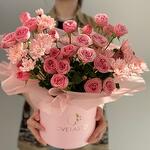 Композиция в коробке в розовых оттенках с кустовой хризантемой и пионовидной кустовой розой — мягкая, женственная и уютная. Хризантема придаёт воздушность и фактуру, а пионовидная роза добавляет объёма и трогательной утончённости. Оттенки варьируются от нежно-розового до чуть более насыщенного — в этой гармонии легко чувствуется забота и тепло. Композиция выглядит аккуратно и стильно — её дарят, когда хочется подарить хорошее настроение и нежные эмоции. Собрана из свежих цветов и доставлена быстро и бережно — чтобы каждая деталь дошла в идеальном виде и порадовала сразу.