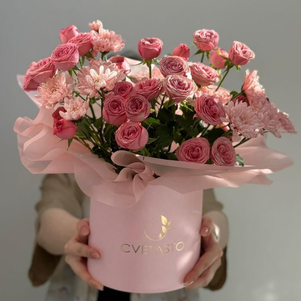 Композиция в коробке в розовых оттенках с кустовой хризантемой и пионовидной кустовой розой — мягкая, женственная и уютная. Хризантема придаёт воздушность и фактуру, а пионовидная роза добавляет объёма и трогательной утончённости. Оттенки варьируются от нежно-розового до чуть более насыщенного — в этой гармонии легко чувствуется забота и тепло. Композиция выглядит аккуратно и стильно — её дарят, когда хочется подарить хорошее настроение и нежные эмоции. Собрана из свежих цветов и доставлена быстро и бережно — чтобы каждая деталь дошла в идеальном виде и порадовала сразу.