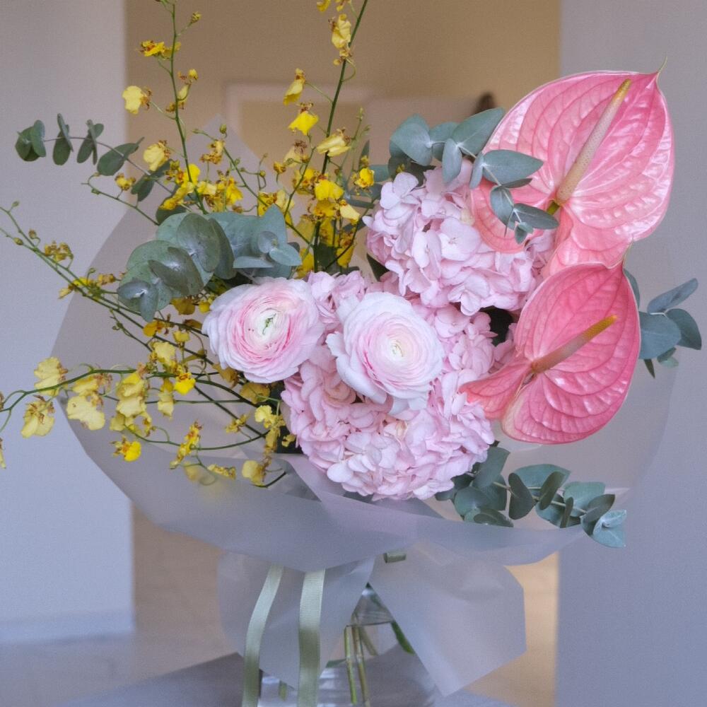 Эвкалипт - 4 дана Қызғылт Гортензия - 2 дана Ранункулюс розовый - 2 дана антуриум розовый - 2 дана онцидиум желтый - 3 дана