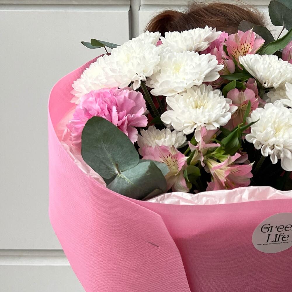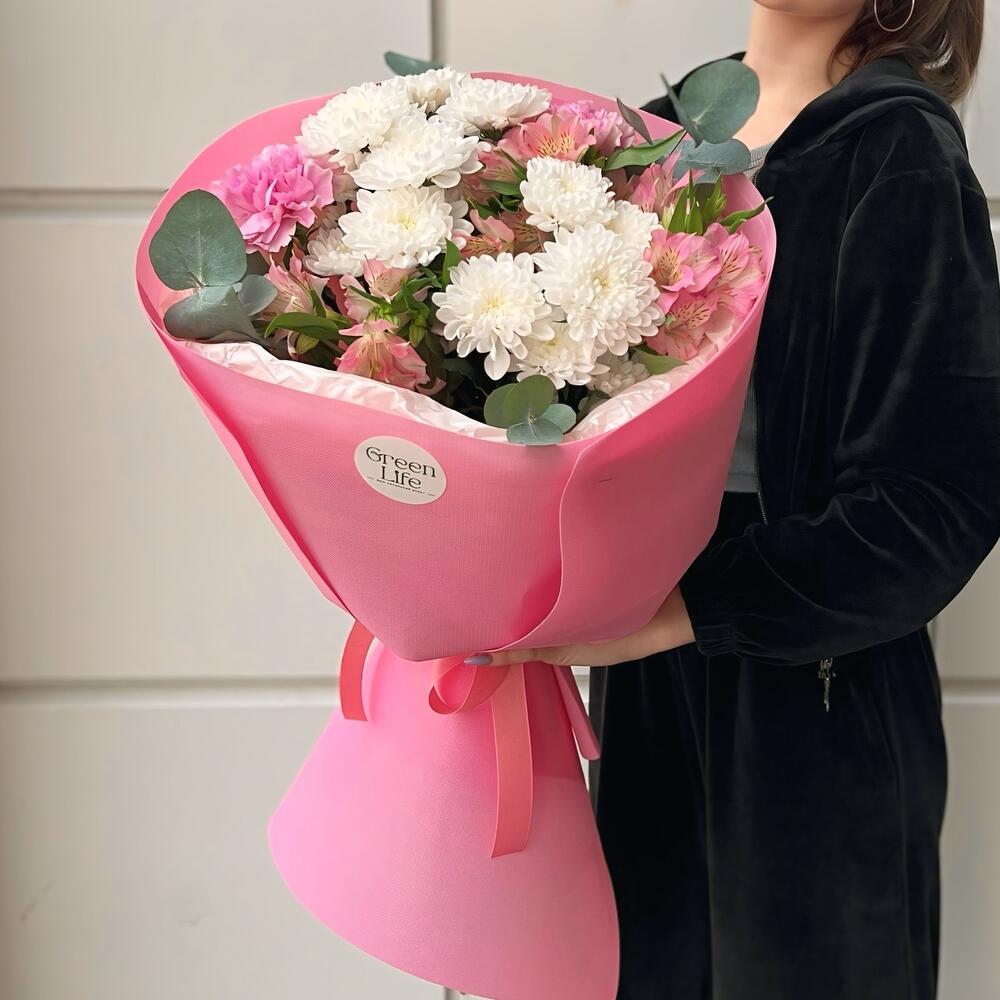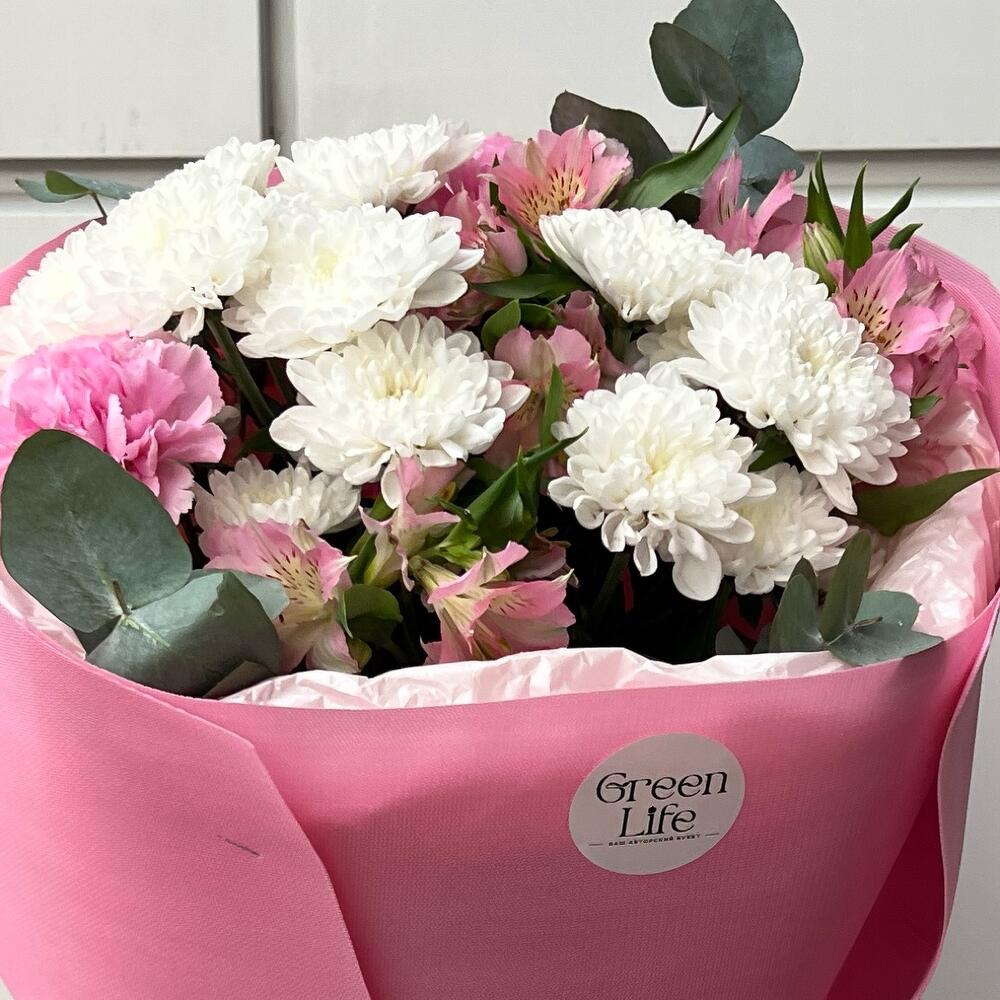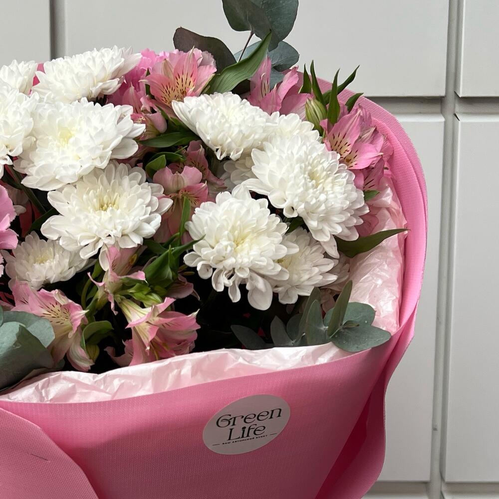 Альстроэмерия - 3 дана Эвкалипт - 1 дана Хризантема - 2 дана Диантус - 3 дана