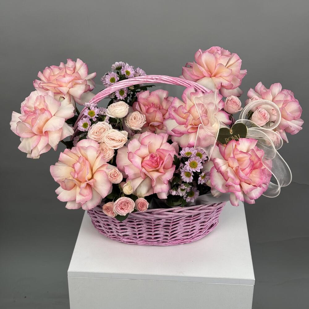 Нежная розовая корзина, наполненная раскрытыми розами, кустовыми розами и хризантемами розового сорта Сантини. Утонченная композиция гармонично сочетает разные оттенки и текстуры, создавая атмосферу нежности и романтики. Этот букет идеально подходит для особенных случаев, чтобы выразить любовь, благодарность или поздравление.