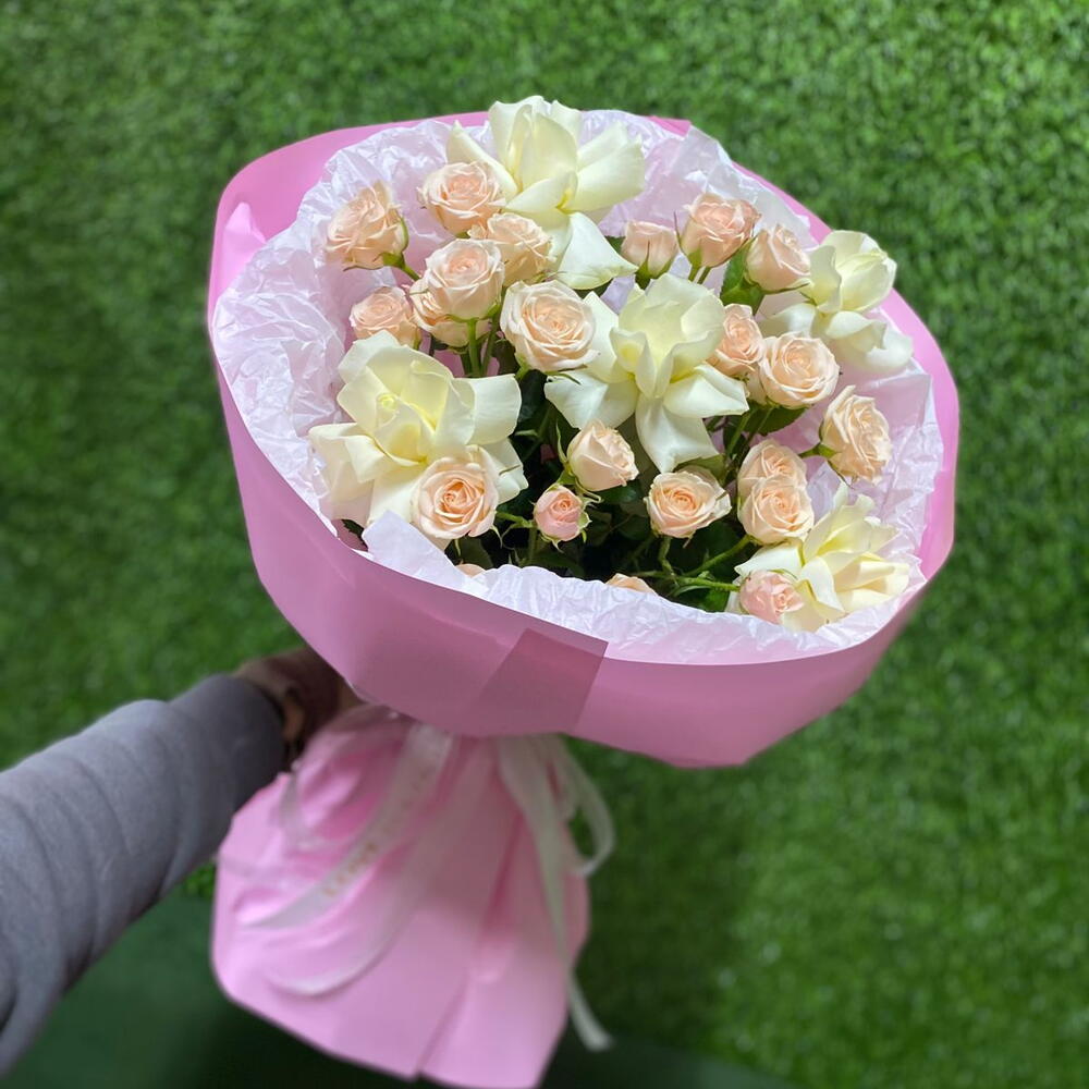 Бұта раушаны - 4 дана ақ француздық раушан - 5 дана