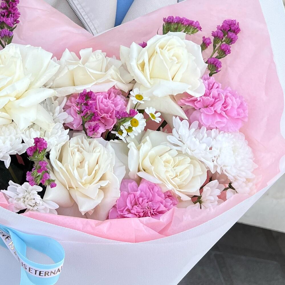 Статица - 2 дана Хризантема бұтасы - 2 дана Ромашка - 1 дана Диантус - 3 дана Дизайнерлік қаптама - 1 дана плая бланка - 5 дана