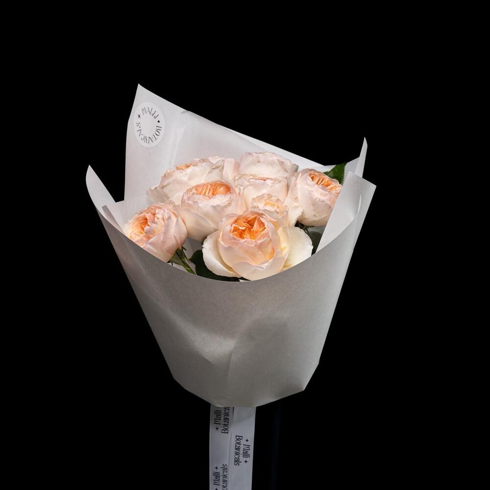 Букет из роз сорта Juliette — это воплощение нежности и утончённой элегантности. Их кремово-персиковые лепестки, словно вырезанные из шелка, создают атмосферу тепла, романтики и безмятежности. Оформлен в фирменную упаковку Malli Botanicals с возможностью дополнить открыткой. На фото букет в размере S, 9шт.