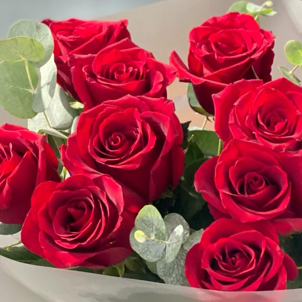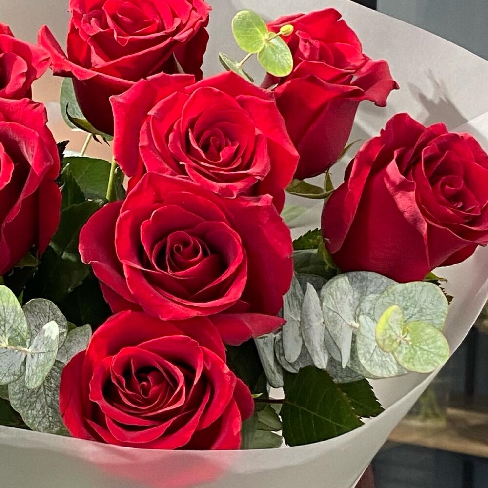 Эвкалипт - 5 дана Дизайнерлік қаптама - 1 дана Красная роза 50 см - 11 дана аквабокс с водой для транспортировки - 1 дана открытка бесплатная на выбор - 1 дана