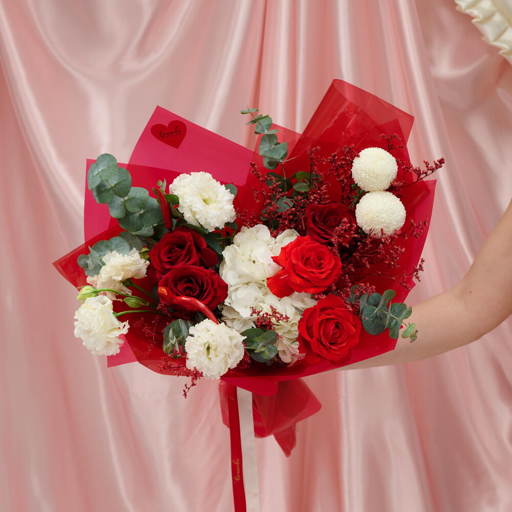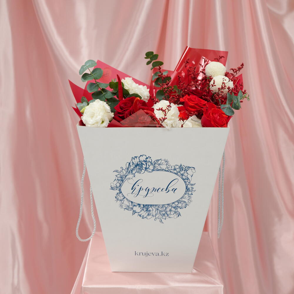 Гортензия - 1 дана Лимониум - 1 дана Орау - 1 дана Бұрыш - 3 дана Эвкалипт Цинерея - 1 дана ақ эустома - 2 дана Эквадор раушаны - 3 дана нина раушан - 2 дана момоко хризантема - 2 дана