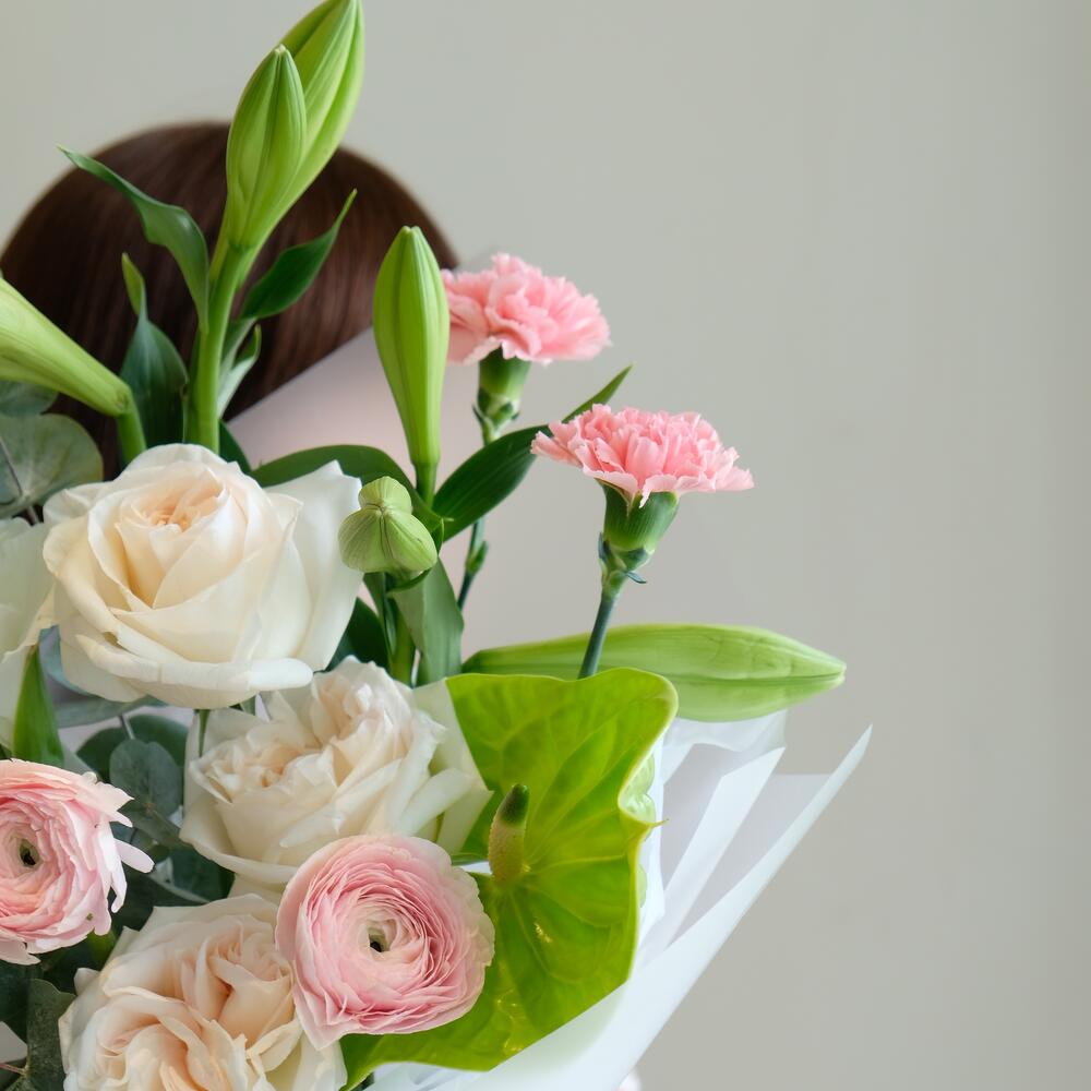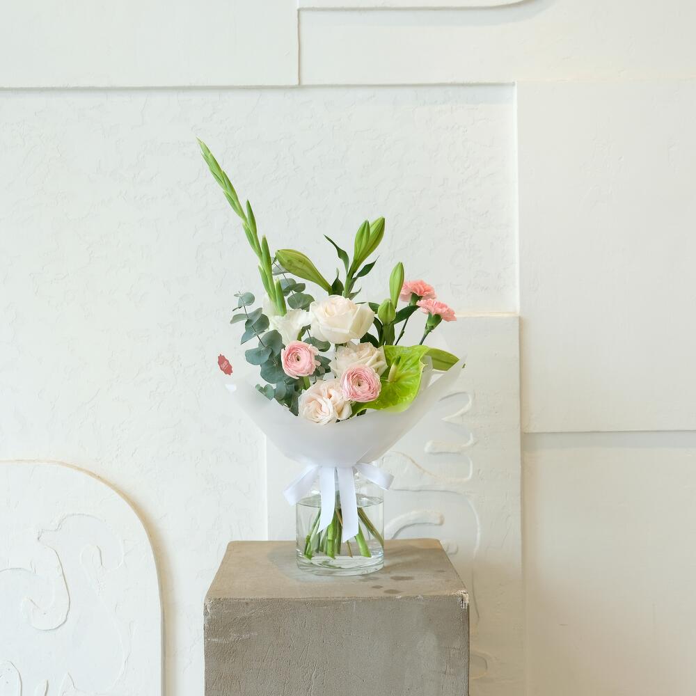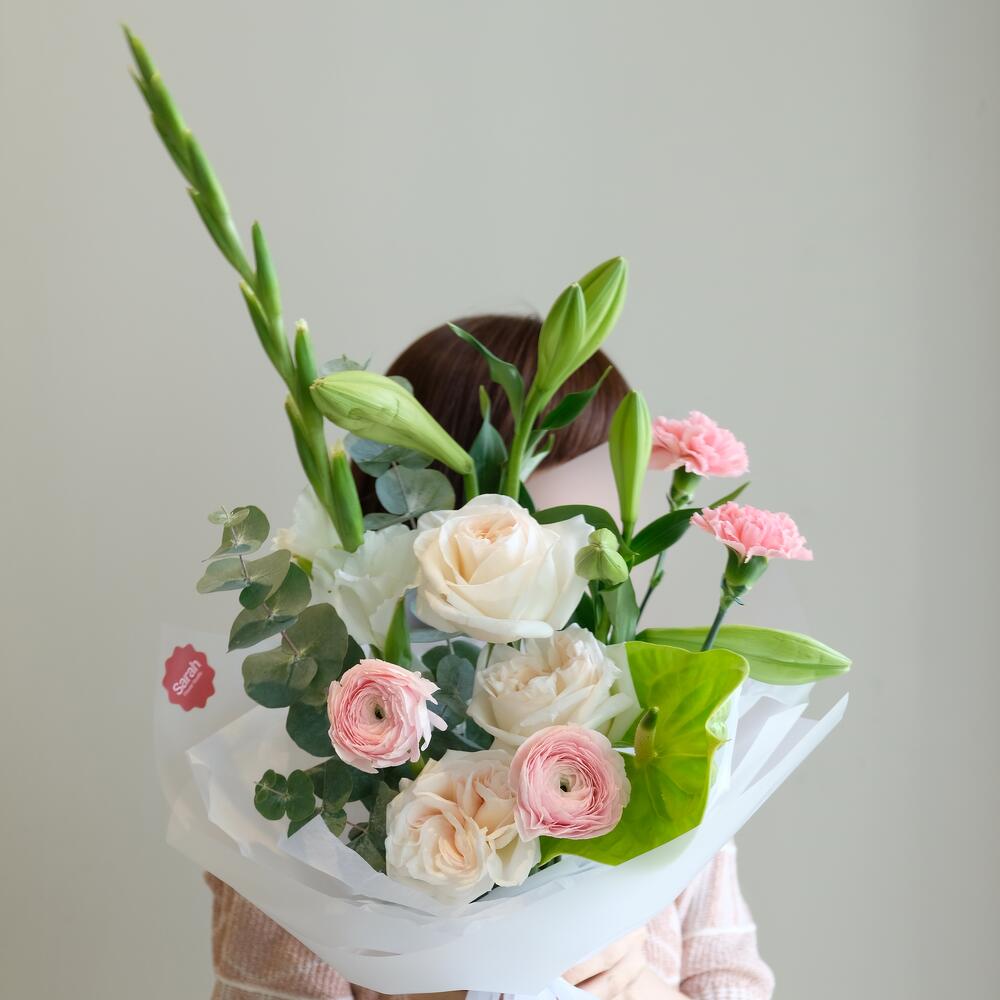 Антуриум - 1 дана Лилия - 2 дана Эвкалипт - 1 дана Гвоздика - 2 дана Ранункулюс - 2 дана Пионовидная роза - 3 дана Гладиолус - 1 дана