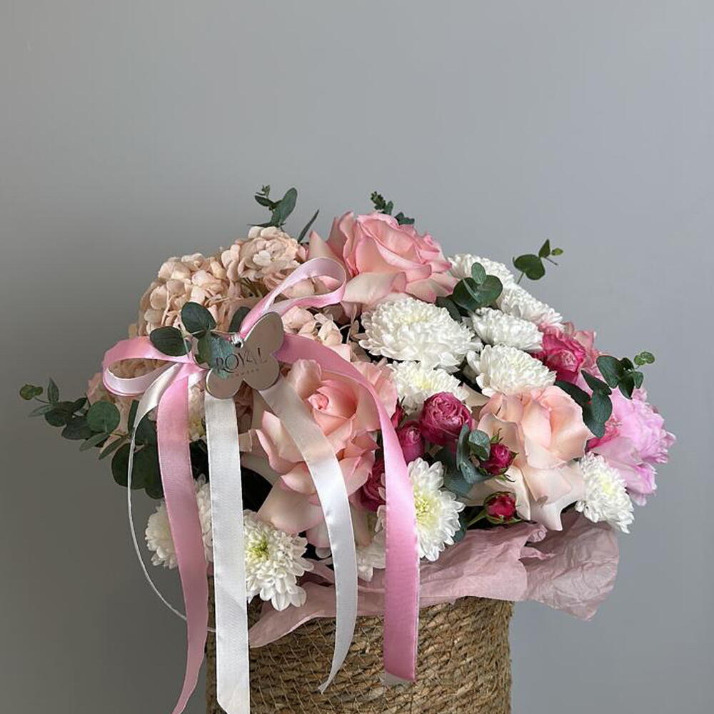 Гортензия - 1 дана Пион - 1 дана Эвкалипт - 1 дана Раушан - 3 дана Бұта раушаны - 3 дана Хризантема - 3 дана