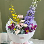дельфиниум - 1 дана Қызғалдақ - 3 дана Эвкалипт - 1 дана Гербера - 2 дана Диантус - 3 дана сары онцидиум - 1 дана