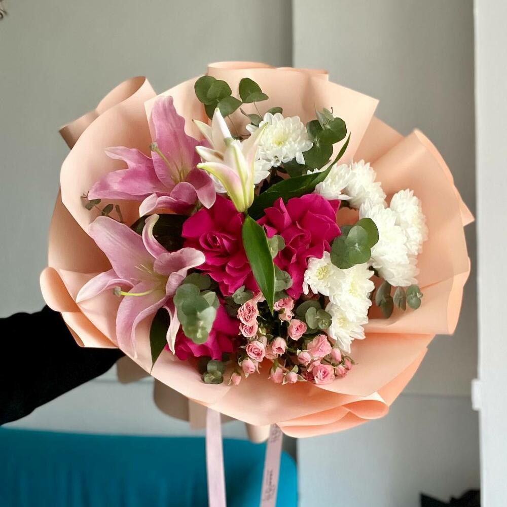 Лилия - 1 дана Бұта раушаны - 2 дана Хризантема бұтасы - 3 дана Эвкалипт - 2 дана Роза розовая - 3 дана