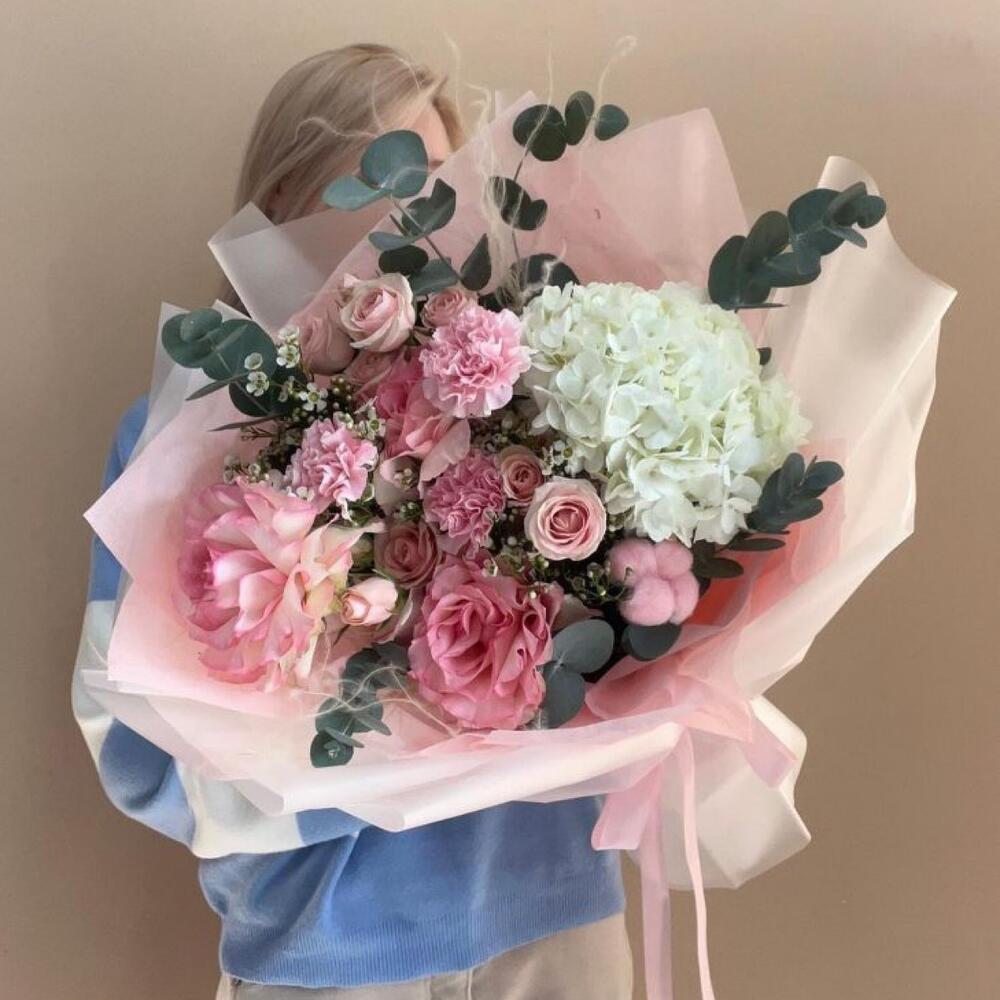 Ваксфлауэр - 1 дана Гортензия - 1 дана Эвкалипт - 3 дана Гвоздика - 3 дана Спрей роза - 2 дана раушан - 2 дана розы вывернутые - 3 дана