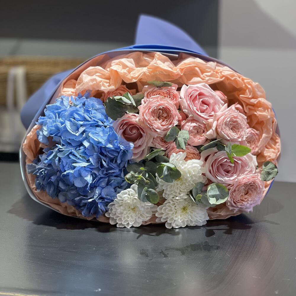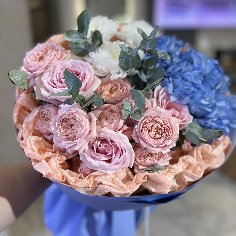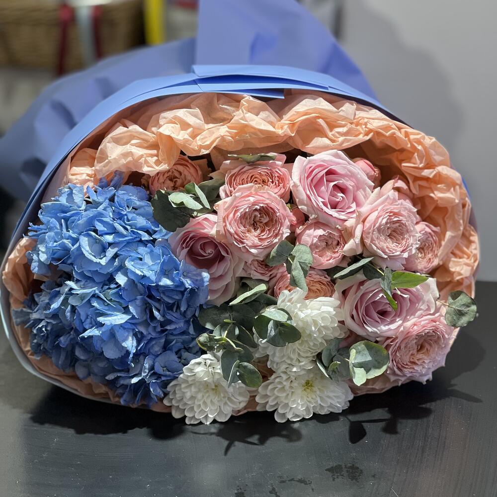 Гортензия - 1 дана Хризантема бұтасы - 1 дана Эвкалипт - 2 дана Раушан - 3 дана Кустовая роза пионовидная - 2 дана