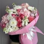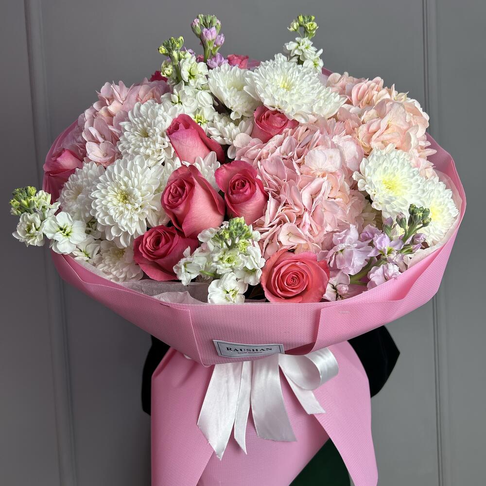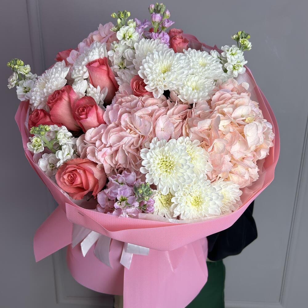 Маттиола - 6 дана Раушан - 11 дана Хризантема - 3 дана Қызғылт Гортензия - 3 дана
