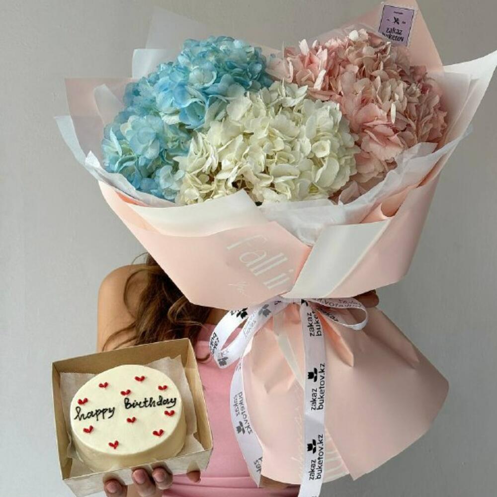 Бенто и 3 гортензии – нежный сет, наполненный гармонией и теплом. Пышный букет из трёх гортензий – небесно-голубой, молочной и пудрово-розовой – дополнен милым бенто-тортом Happy Birthday.