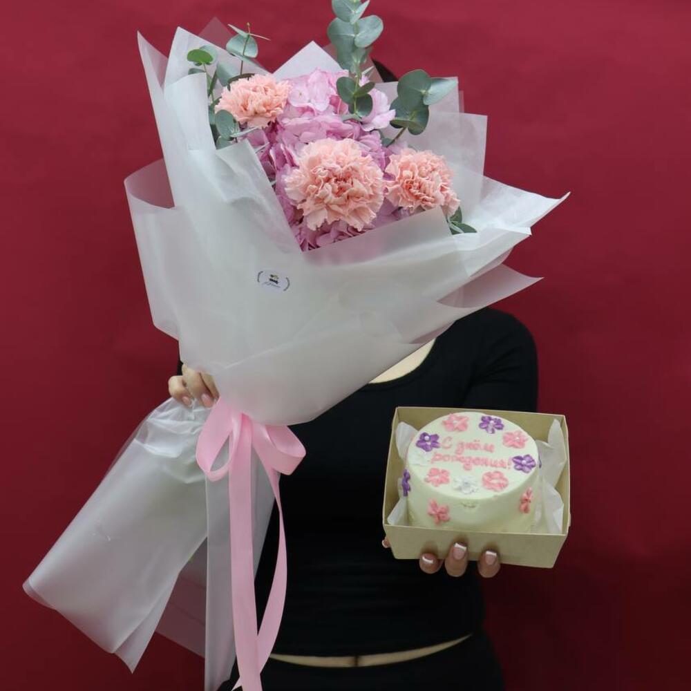Гортензия - 1 дана Эвкалипт - 1 дана Гвоздика - 3 дана бенто торт - 1 дана
