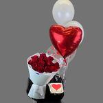 Красные и белые воздушные шары + букет из алых роз + вкусный десерт. Всё, что нужно для атмосферы любви и счастья!