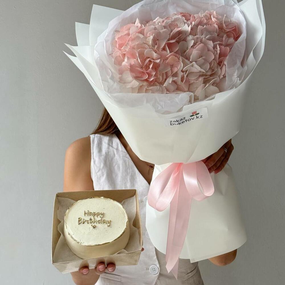 Нежный миг – утончённый сет для самых тёплых поздравлений. Воздушный букет из нежно-розовой гортензии и элегантный мини-торт с надписью Happy Birthday создают особое настроение и превращают момент в настоящее волшебство.