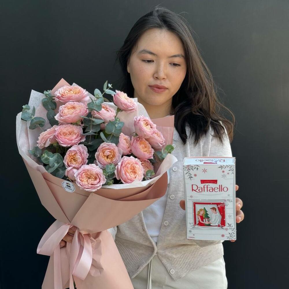 Эвкалипт - 2 дана Бұта раушаны - 7 дана коробка конфет раффаэлло - 1 дана