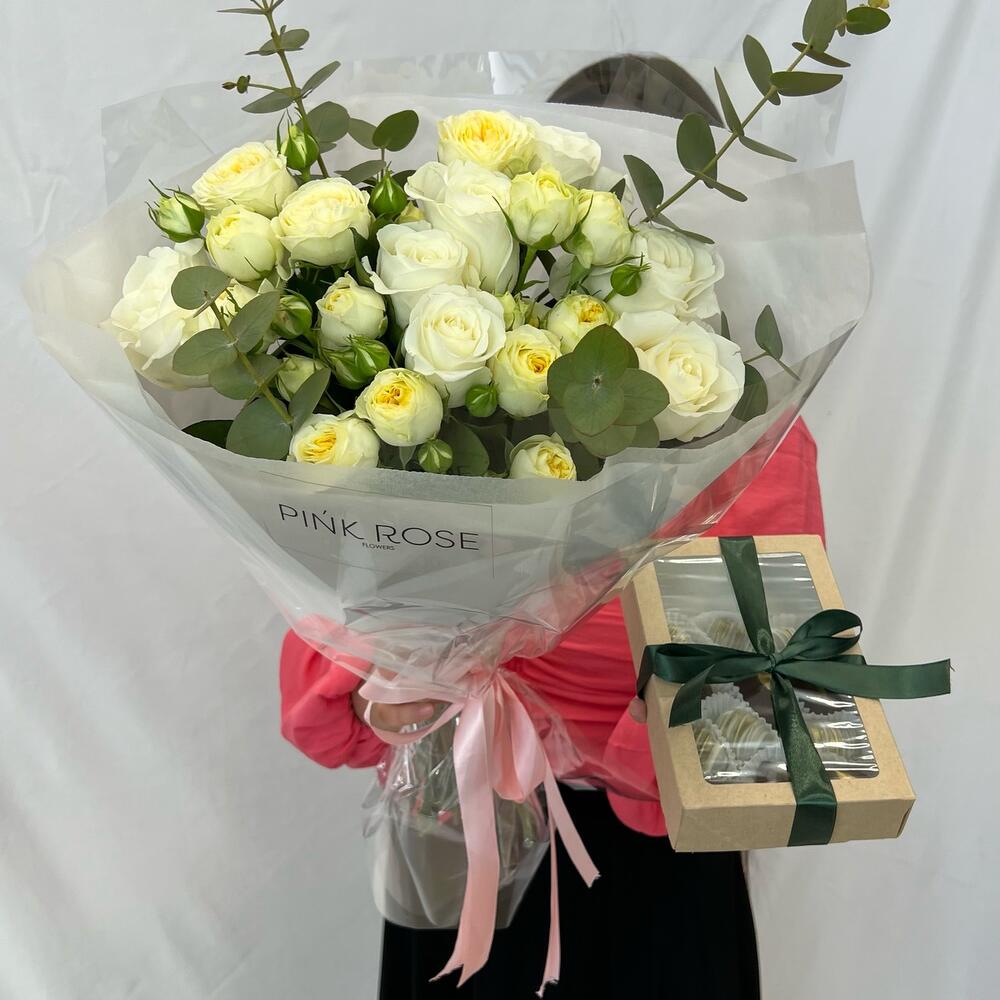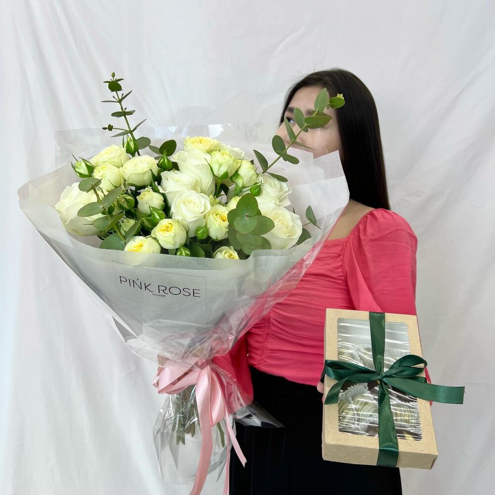 Роза премиум - 7 дана финики в шоколаде - 9 дана кустовые пионовидные розы - 4 дана