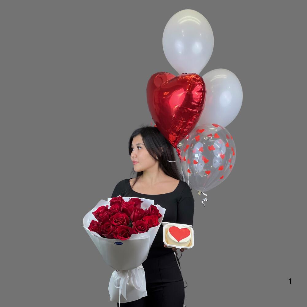 Букет из алых роз + воздушные шары в серебристо-красных оттенках + нежный сладкий комплимент. Этот сет – воплощение страсти и романтики. Подарите любимой эмоции, которые скажут громче любых слов!