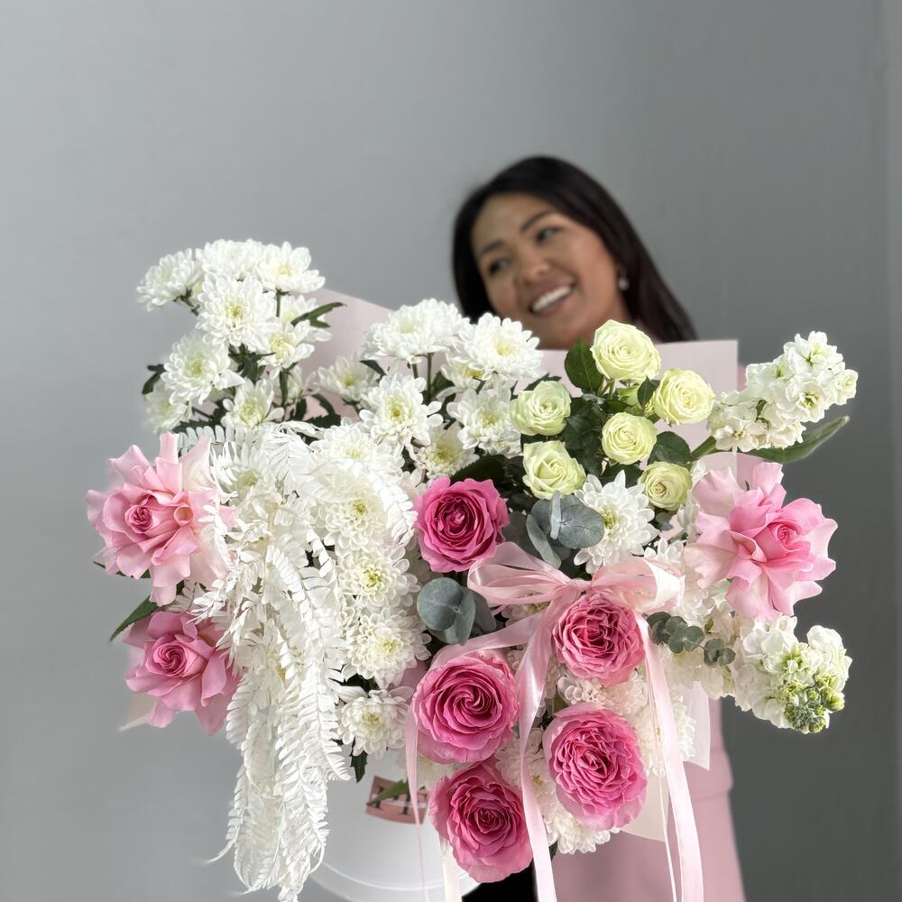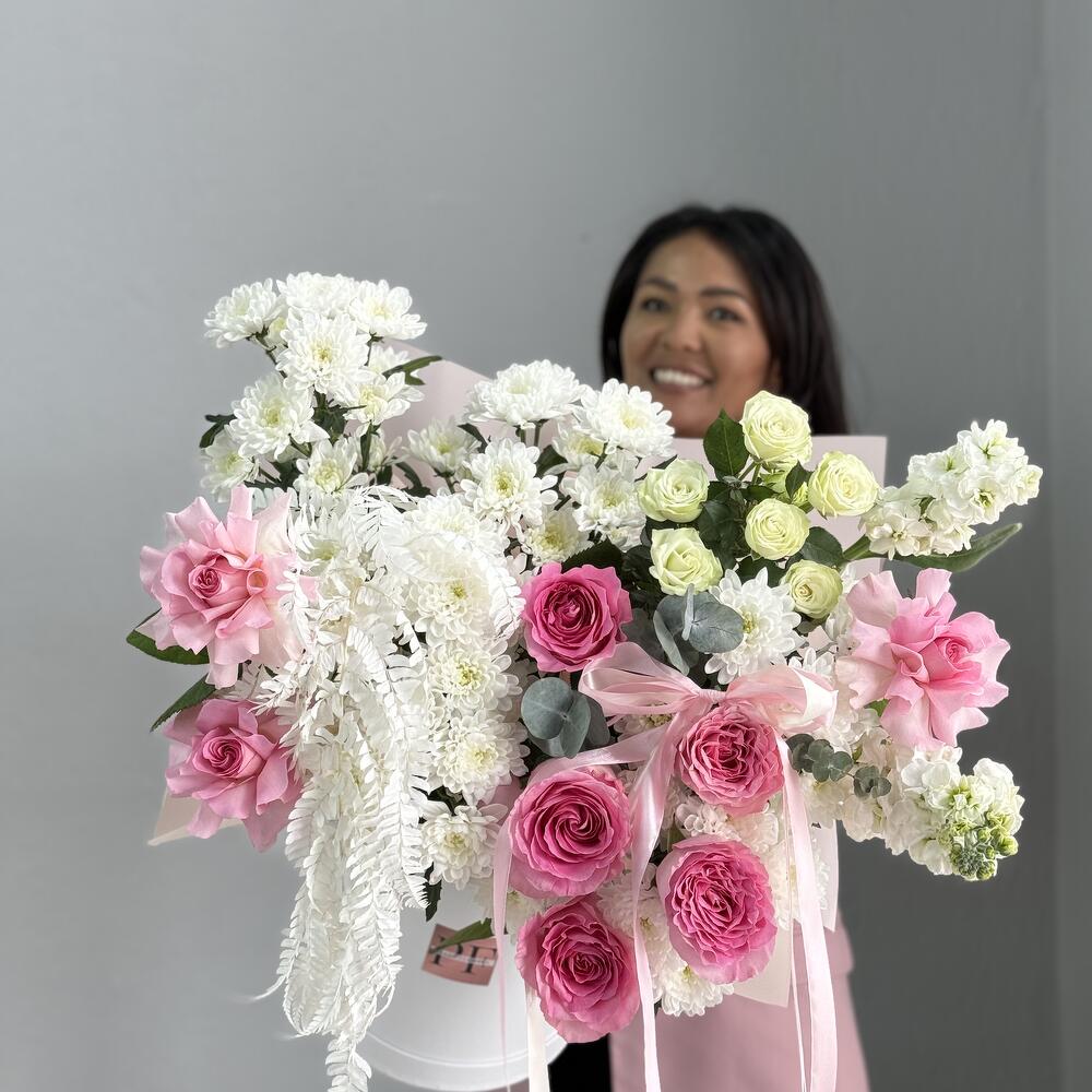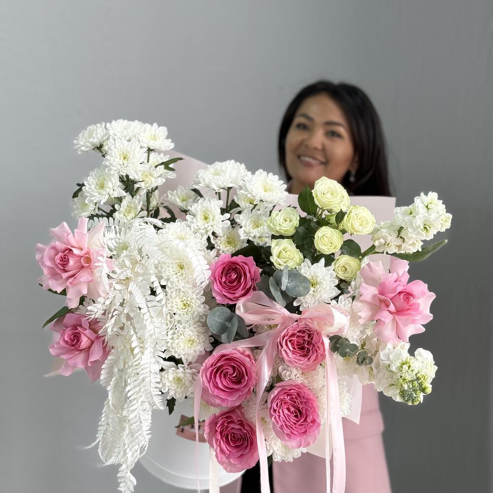 Маттиола - 2 дана Бұта раушаны - 2 дана Роза пионовидная - 50 дана Шляпалар қорабы - 1 дана Эвкалипт Baby Blue - 5 дана Сухоцвет лагурус - 1 дана хризантемы - 5 дана розы французские - 3 дана