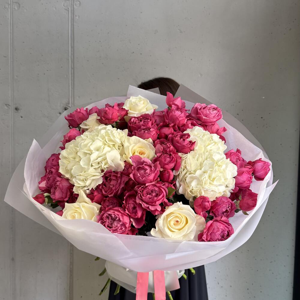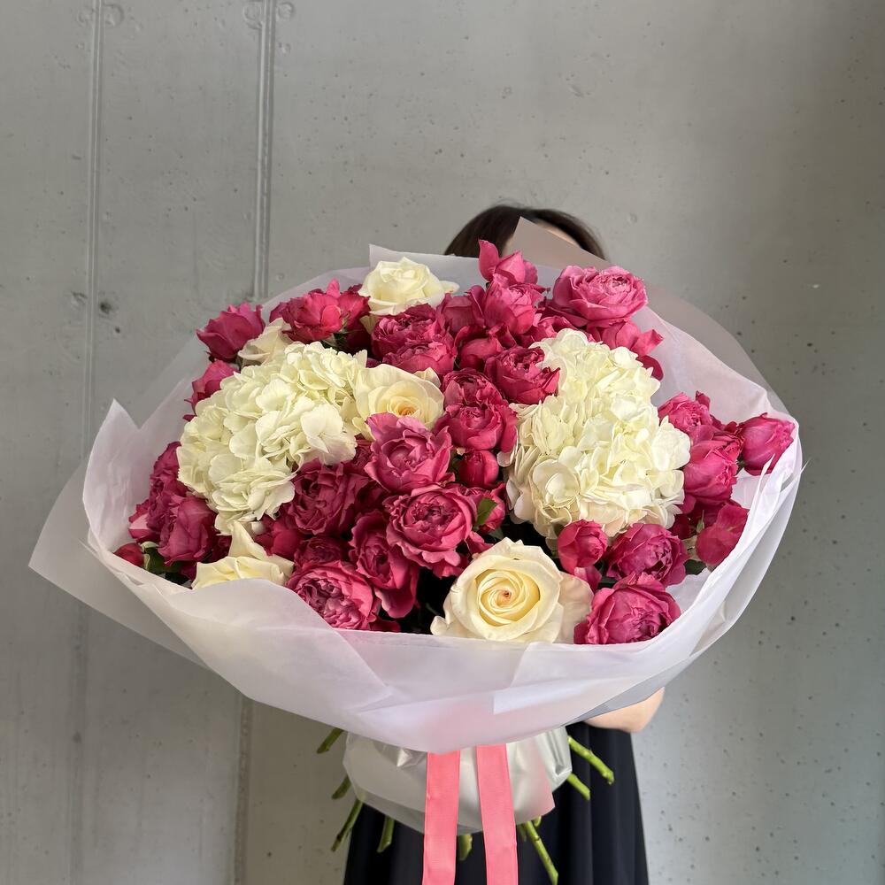 Гортензия - 2 дана розы пионовидные кустовые - 13 дана розы пионовидные - 5 дана