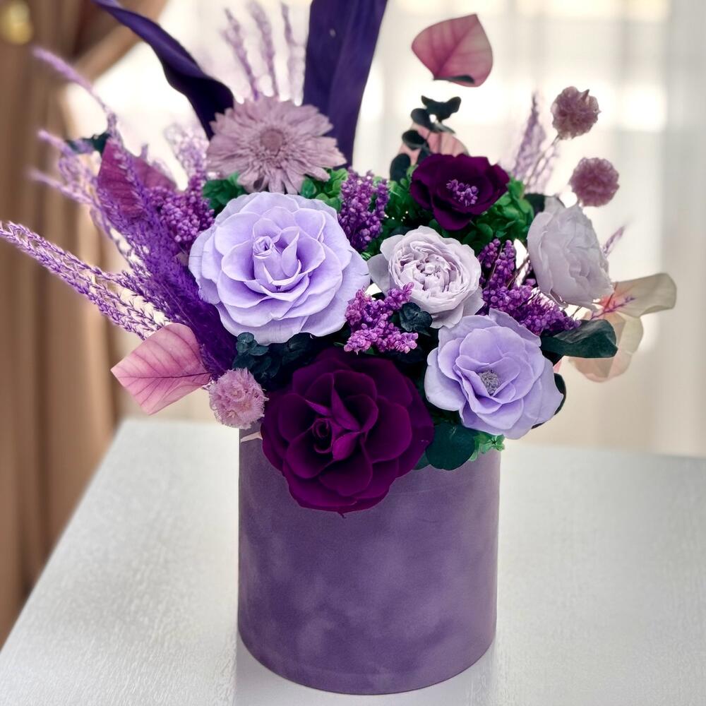 Этот возвышенный ансамбль стабилизированных цветов включает в себя роскошные розы (5 шт) и пышные гортензии (2 шт). Контраст и гармонию сиреневым оттенкам придает зелень необыкновенной свежести (5 веток), а завершающий аккорд этого флористического шедевра становится пара чудесных стабилизированных хризантем пинг понг. Погрузитесь в мир вечной, никогда не увядании красоты.