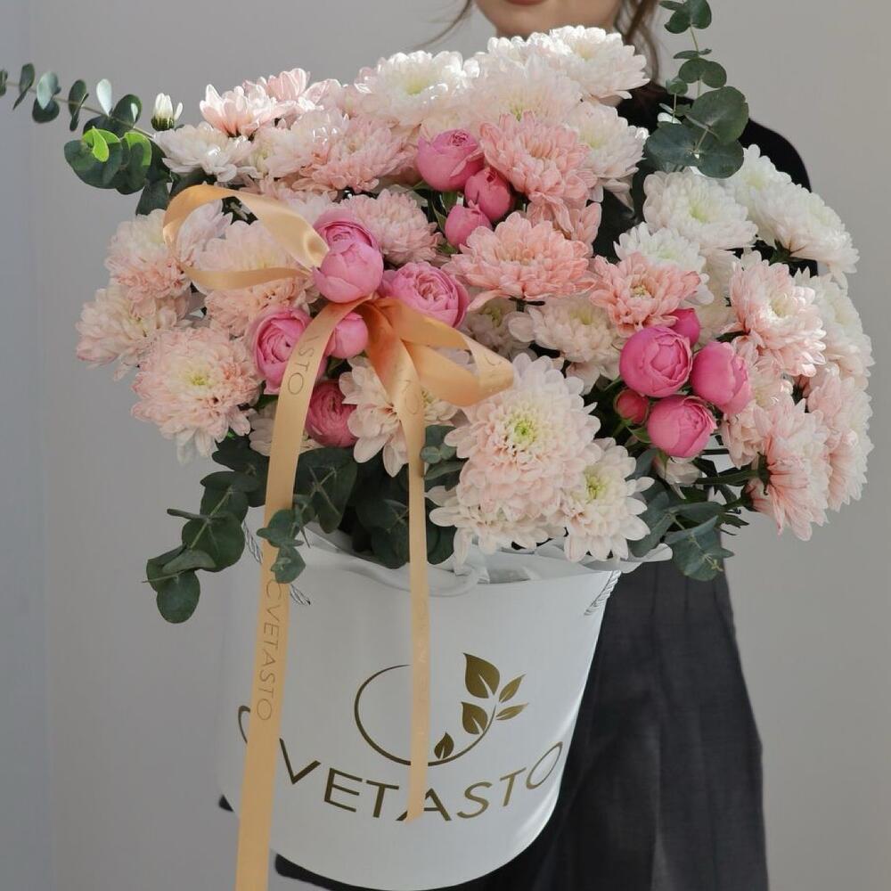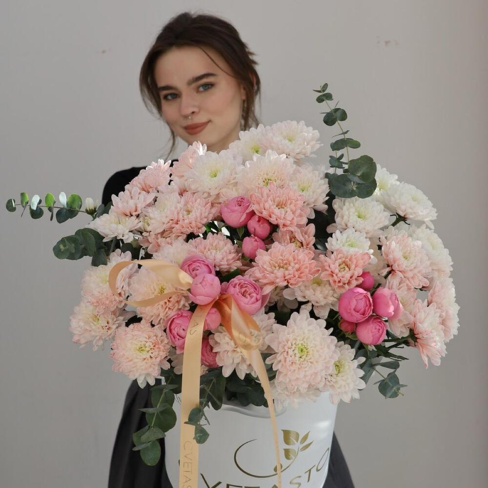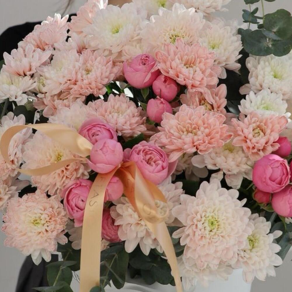 В этой большой коробке собраны цветы, которые олицетворяют утонченную роскошь и изысканность. Хризантемы, нежные кустовые пионовидные розы и свежий эвкалипт создают невероятно стильную композицию, которая привлекает внимание с первого взгляда. Их сочетание дарит атмосферу элегантности и гармонии, добавляя в любой интерьер нотку королевской красоты. Идеальный выбор для тех, кто ценит не только цветы, но и сам процесс создания впечатления. Этот букет станет великолепным подарком для важных событий, подчеркивая ваш вкус и внимание к деталям.