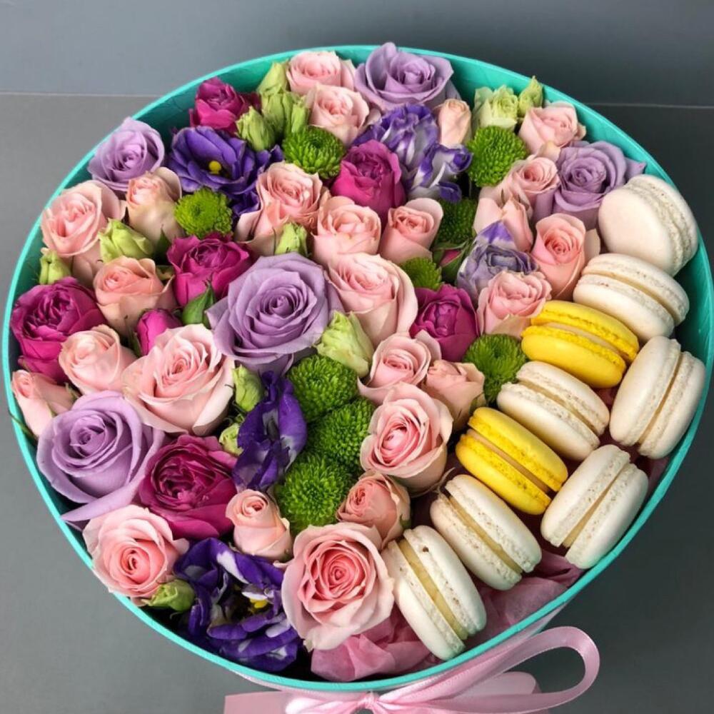 Хризантема бұтасы - 3 дана Бұта раушаны - 5 дана макарон (пирожное) - 9 дана раушан - 5 дана