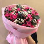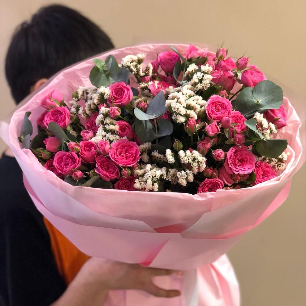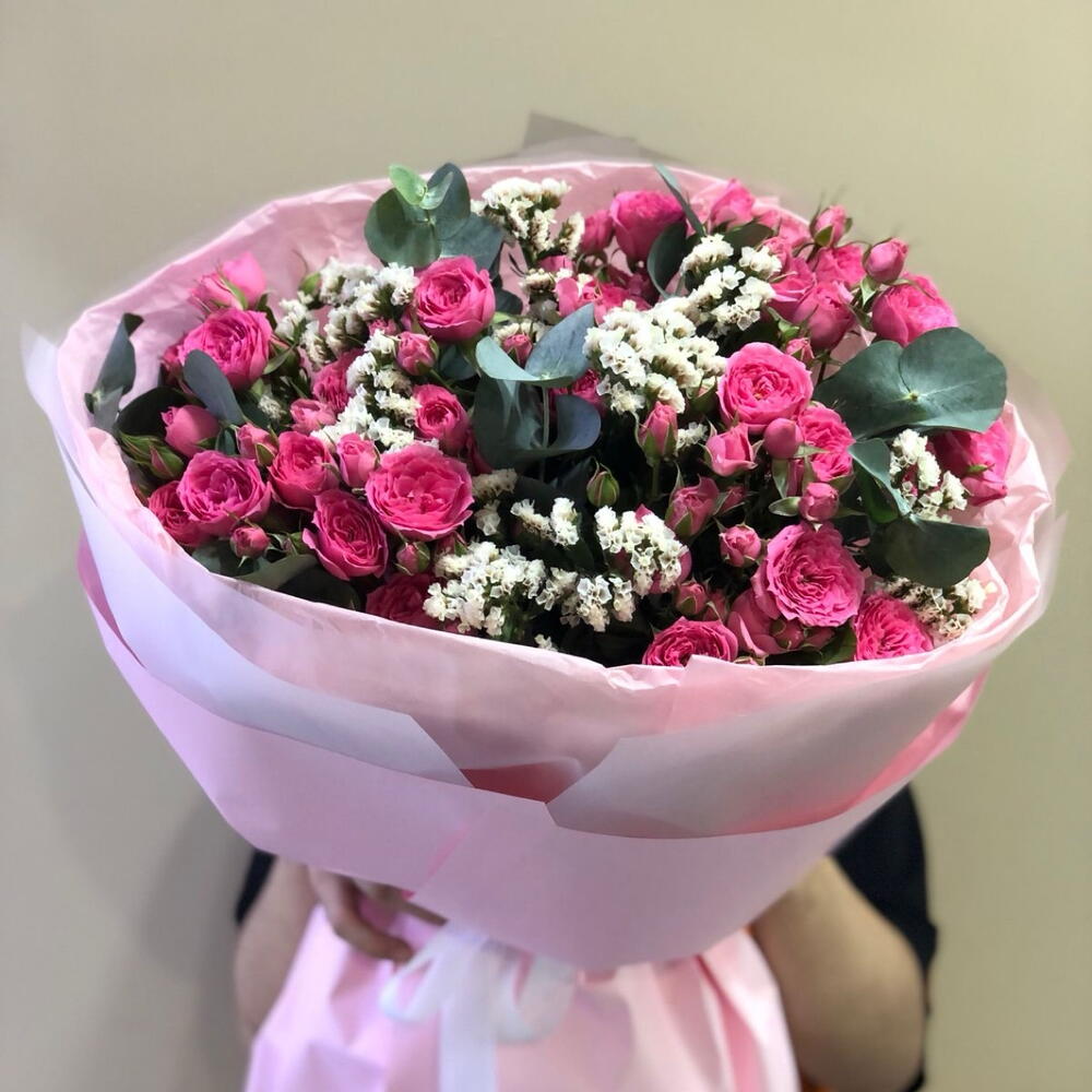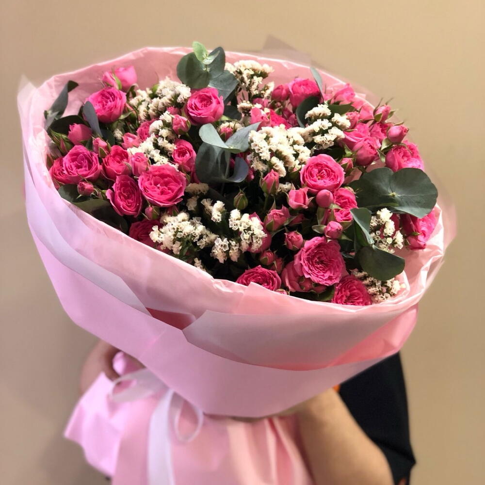 Этот авторский букет станет настоящим произведением искусства в ваших руках. Он состоит из пяти штук нежной статицы, которая предстает символом вечной любви. Спрей роза, девять её штук, добавляет изысканности и глубины букету, а три ветви эвкалипта придают композиции свежести и оригинальности. Этот букет не просто подарок, это - послание, наполненное самыми теплыми и искренними чувствами.