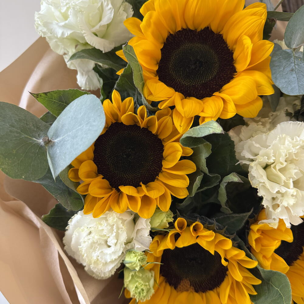 Яркий, стойкий, солнечный букет в составе которого подсолнухи, эвкалипт и лизиантус. Радовать без повода только такими букетами.