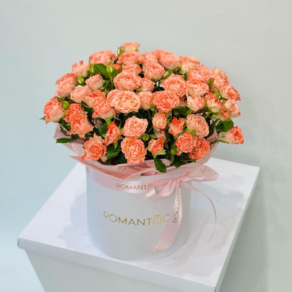 Қораптағы көп бұталы раушан — классика мен заманауи безендірудің үйлесімін көрсететін талғампаз әрі стильді сыйлық. Кішкентай раушан гүлдері қалың, жанды көлем жасап, ал қорап композицияға талғампаздық пен тұтастық береді. Осындай нұсқа құттықтауға, романтикалық тосынсыйға немесе ерекше көңіл білдіруге мінсіз сай келеді.
