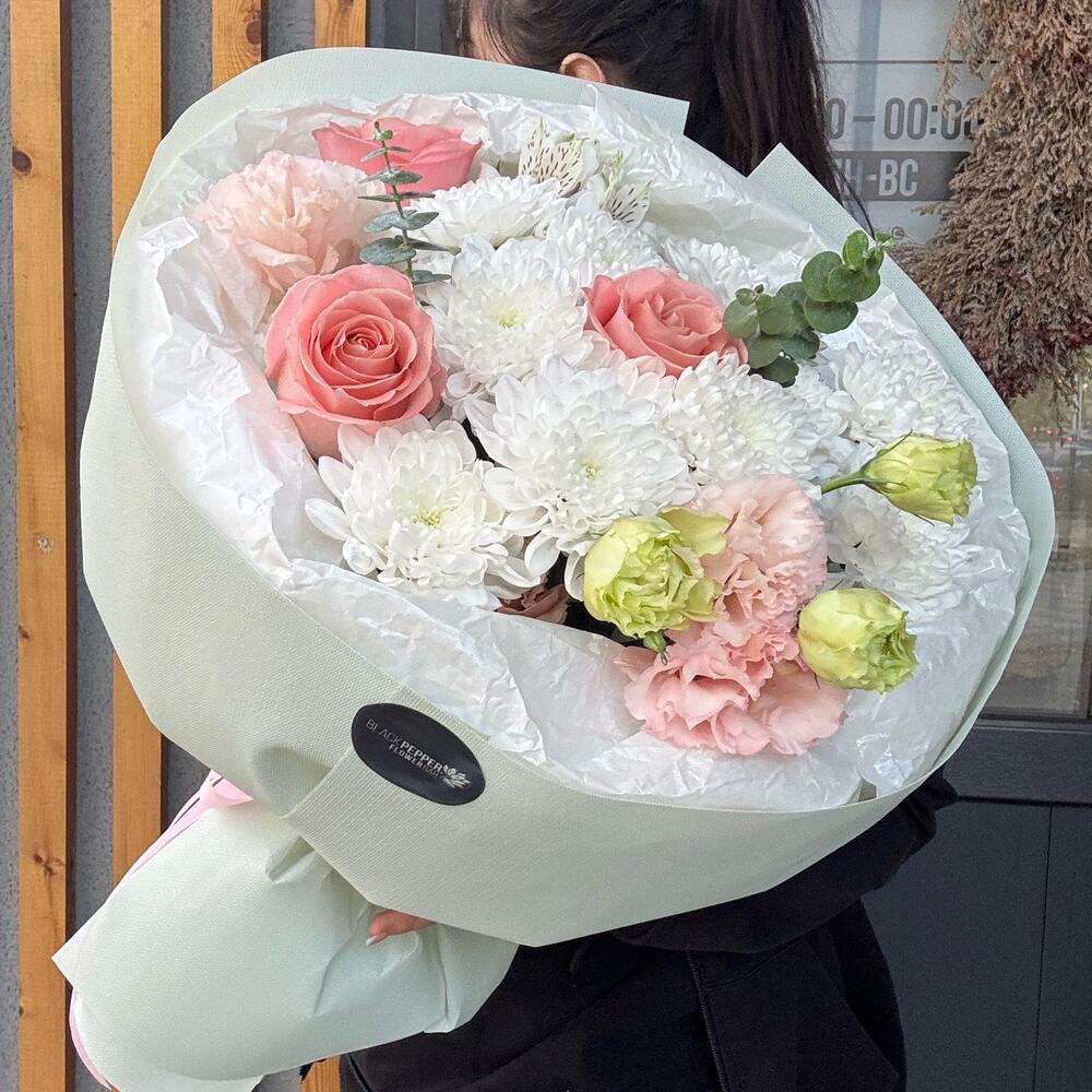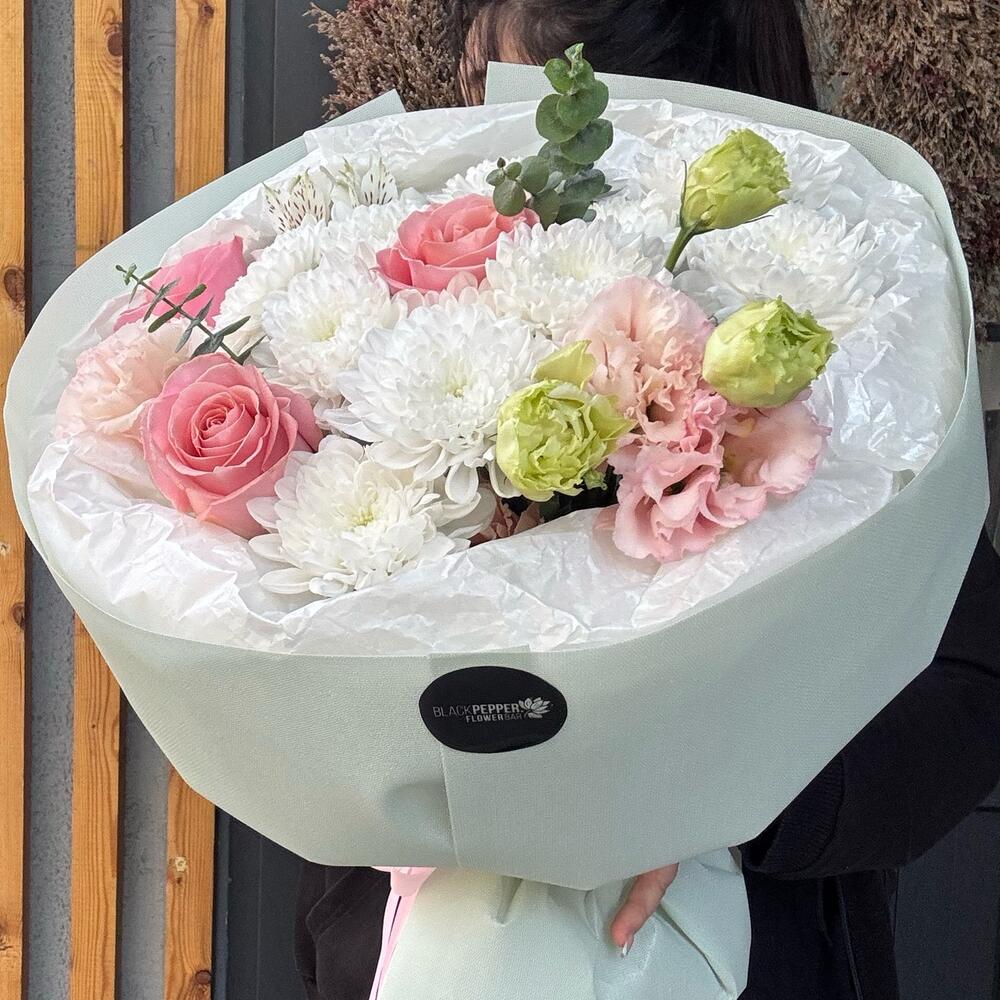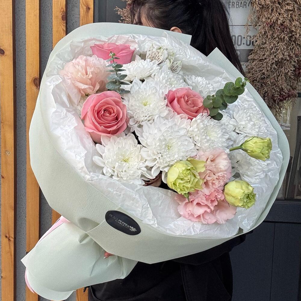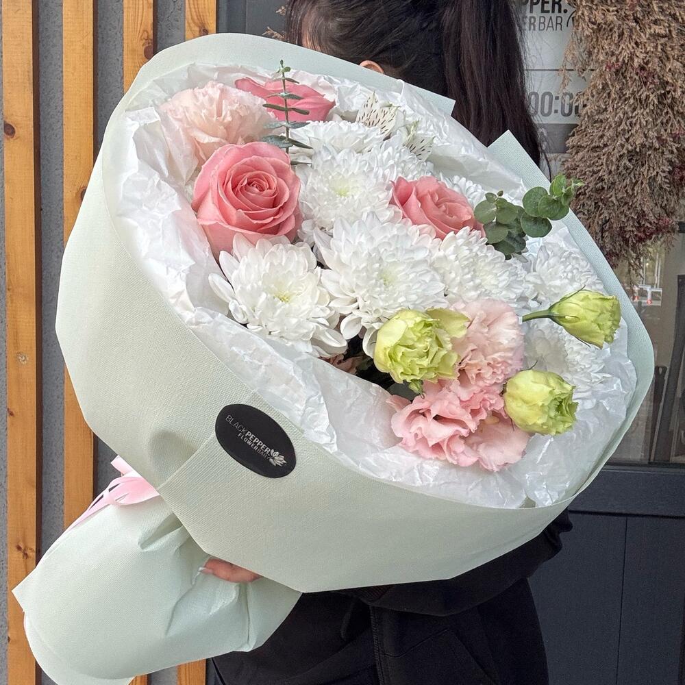 Альстроэмерия - 2 дана Хризантема бұтасы - 4 дана Раушан - 3 дана Эустома - 2 дана