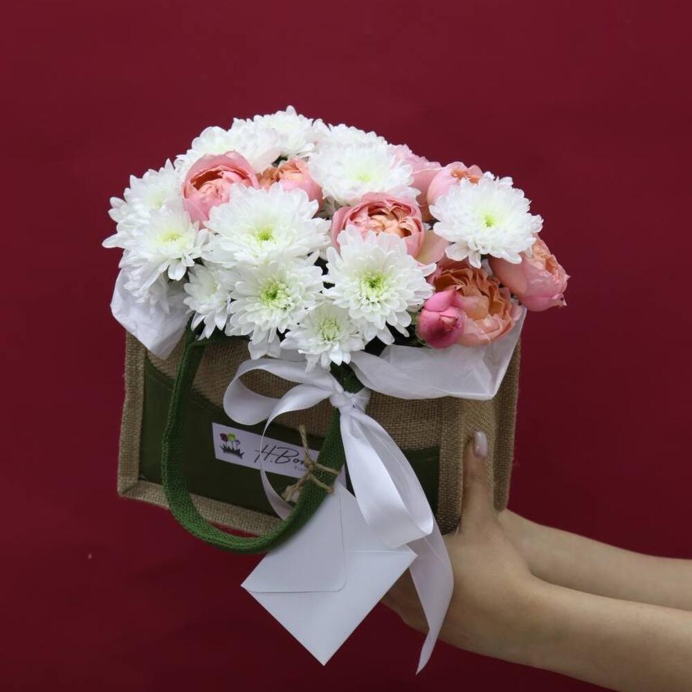 Хризантема бұтасы - 2 дана Бұта раушаны - 3 дана сумка плетеная - 1 дана