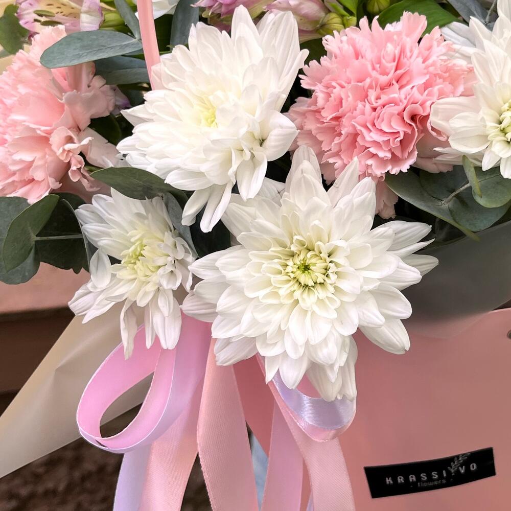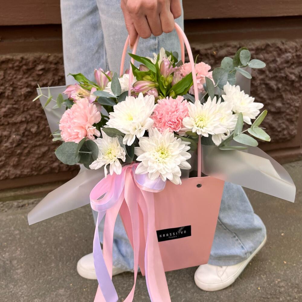 Альстроэмерия - 2 дана Хризантема бұтасы - 1 дана Эвкалипт - 2 дана Атласты таспа - 1 дана Диантус - 3 дана Оазис - 1 дана Сумочка - 1 дана Күңгірт Пленка - 1 дана