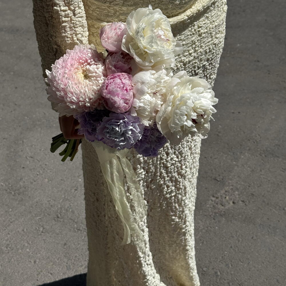 Нежный свадебный букет в пастельных тонах с пионами, хризантемами и диантусами идеально дополнит образ невесты Доставляется на вазе и в транспортировочной коробке. Лента на выбор: кружевная, хлопковая или атласная.