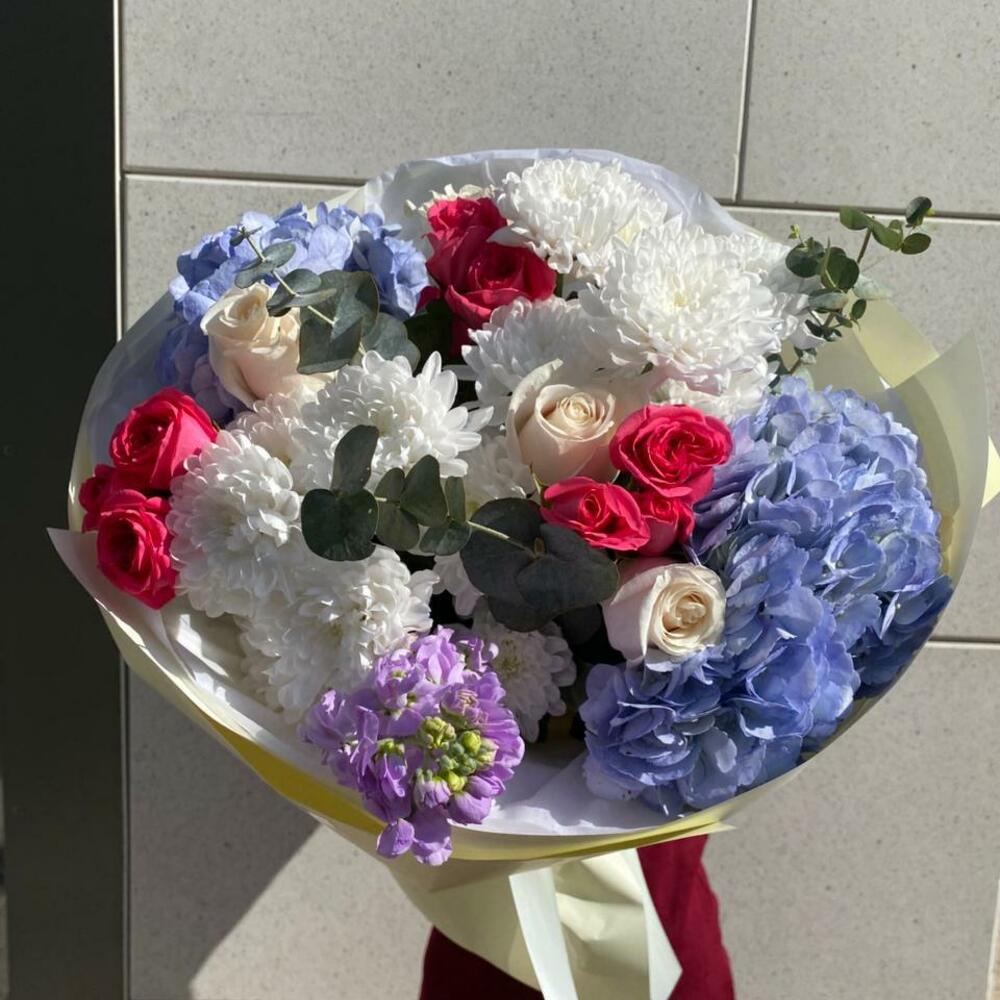 Гортензия - 2 дана Маттиола - 1 дана Эвкалипт - 1 дана Раушан - 4 дана Бұта раушаны - 3 дана Хризантема - 2 дана